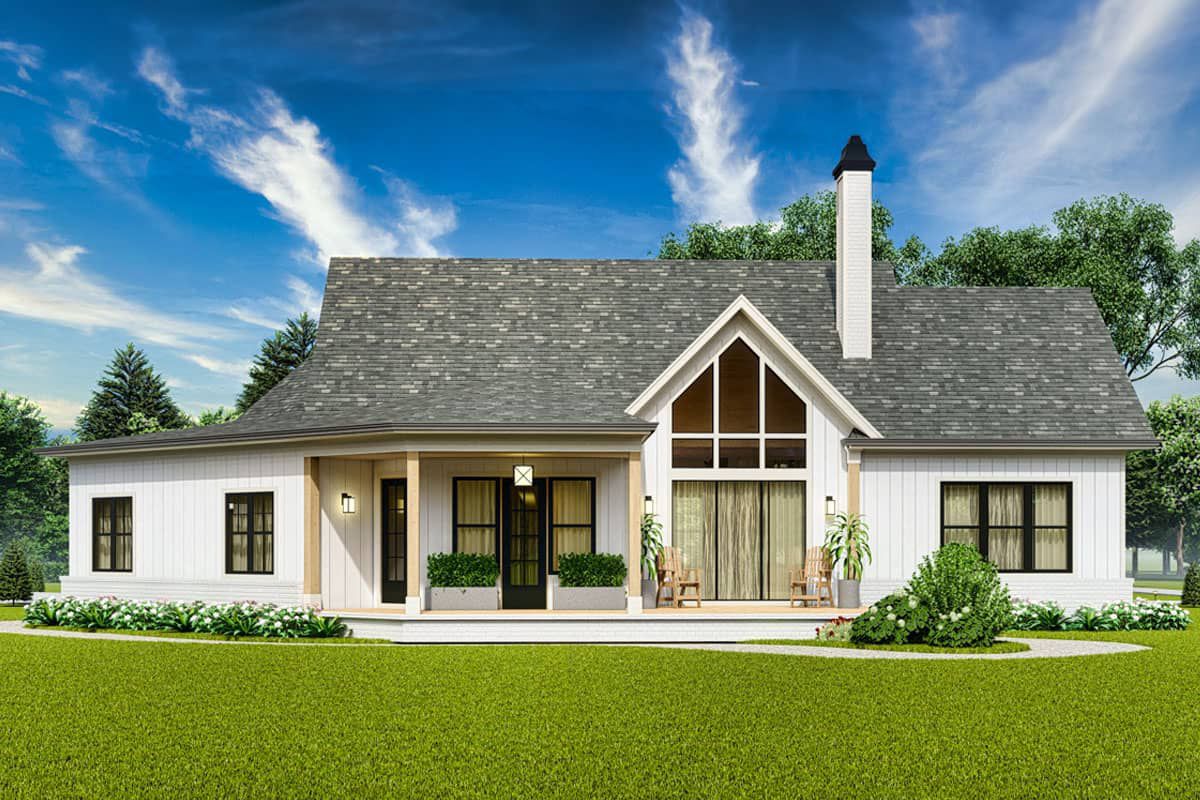 At the rear, a covered patio opens to an open-air space, integrating indoor living with outdoor relaxation.