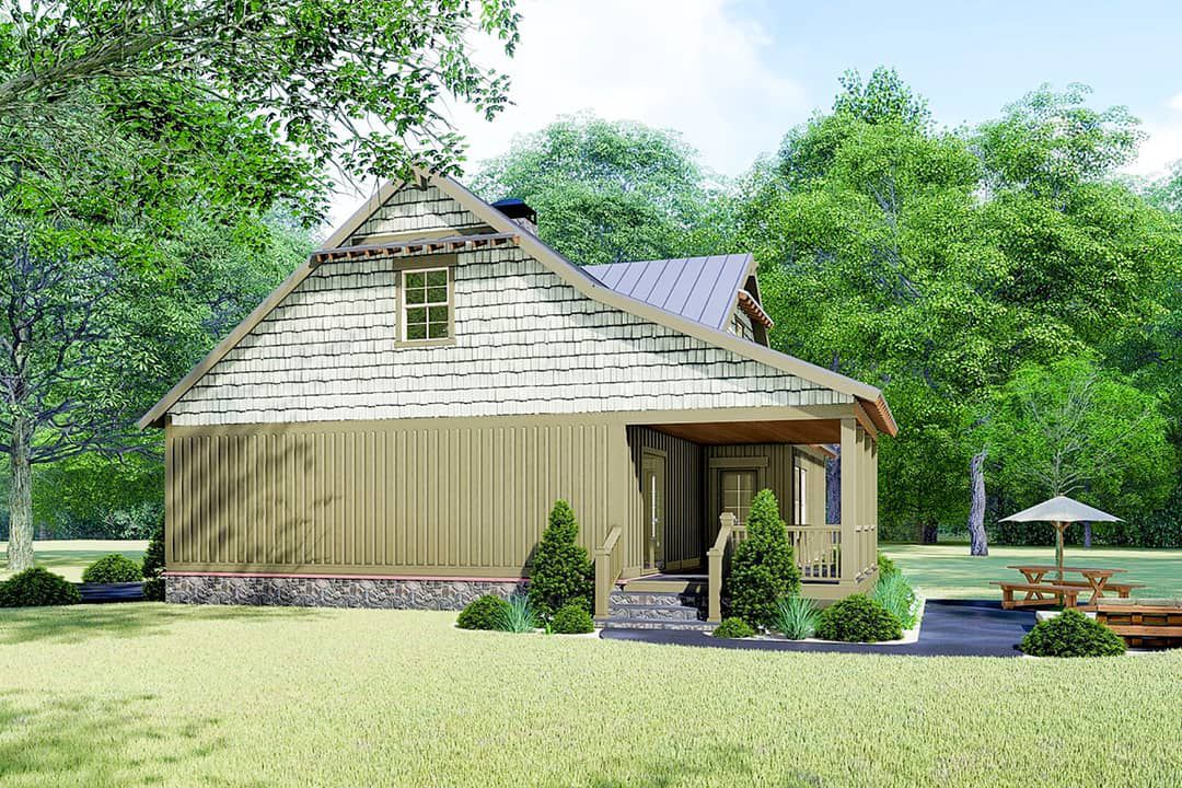 A **vaulted ceiling** over the main living zone enhances the sense of space and volume. Although not explicitly stated, this is a common approach in such rustic cottage designs.