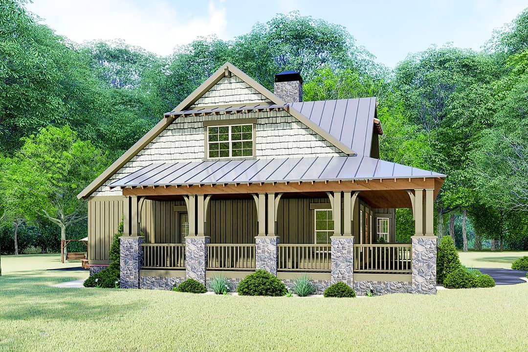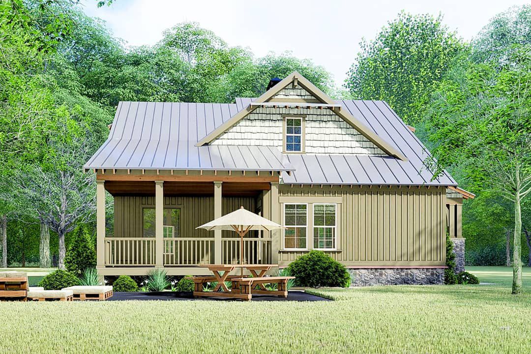 The roof is detailed with **standing seam metal panels**, giving durability and a rugged aesthetic.