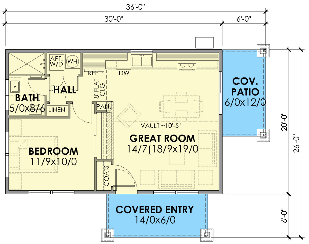 Because of the vaulted ceiling and roof form, modest attic storage or a small loft (if structure permits) might be considered—though it’s not part of the plan as published.