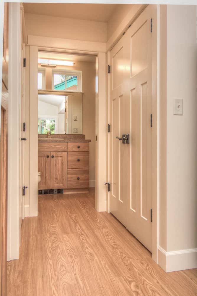 A utility closet tucked off the core houses a stacked washer/dryer and the water heater, keeping services compact yet accessible.