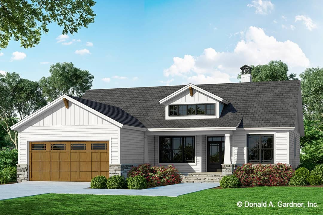 This New American ranch plan presents a clean, modern profile with thoughtful architectural touches. Its exterior blends **white siding**, **natural wood**, and **stone accents** for a striking contrast.