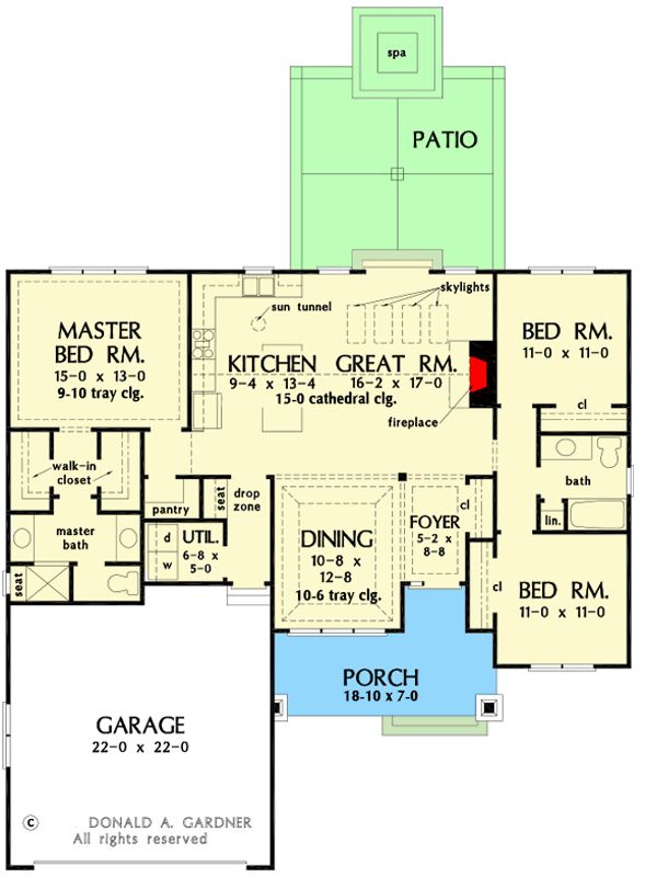 The 15′ cathedral ceiling and clean rooflines may permit future attic storage or loft conversion in some zones (depending on structure and code), but none is shown.
