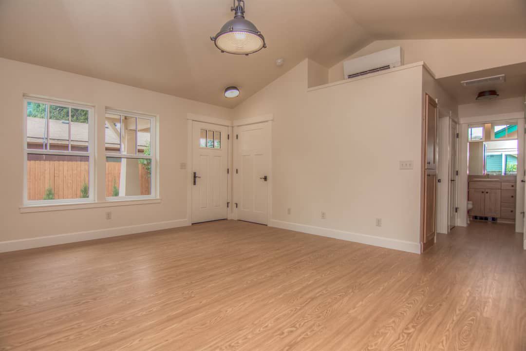 The heart of the home is an open great room / kitchen / dining zone, all under a **15′ cathedral ceiling**. The cathedral volume helps create a sense of spaciousness even in modest square footage.