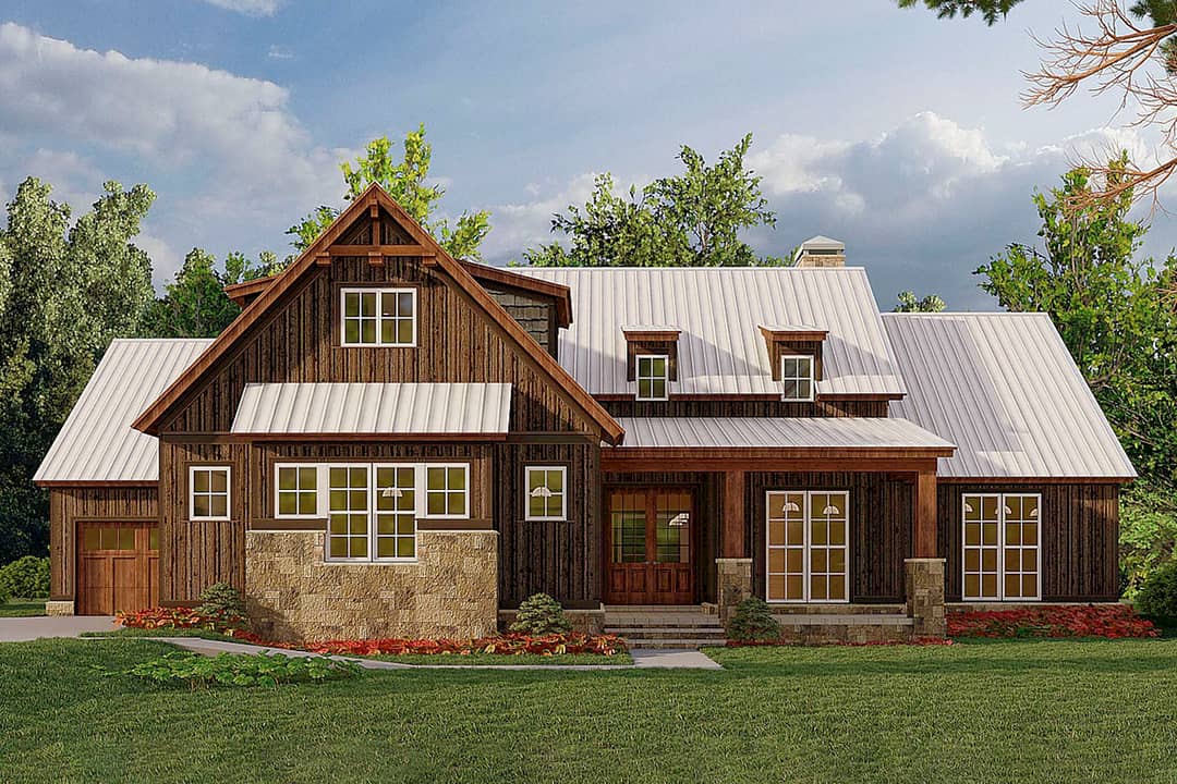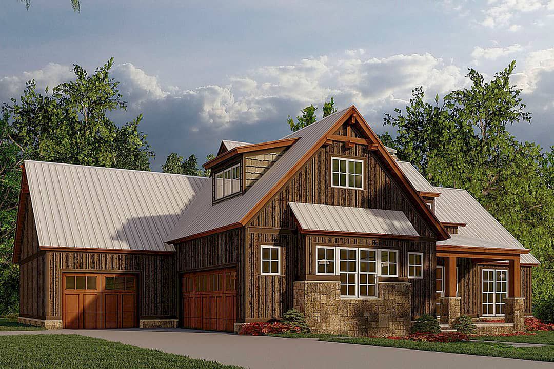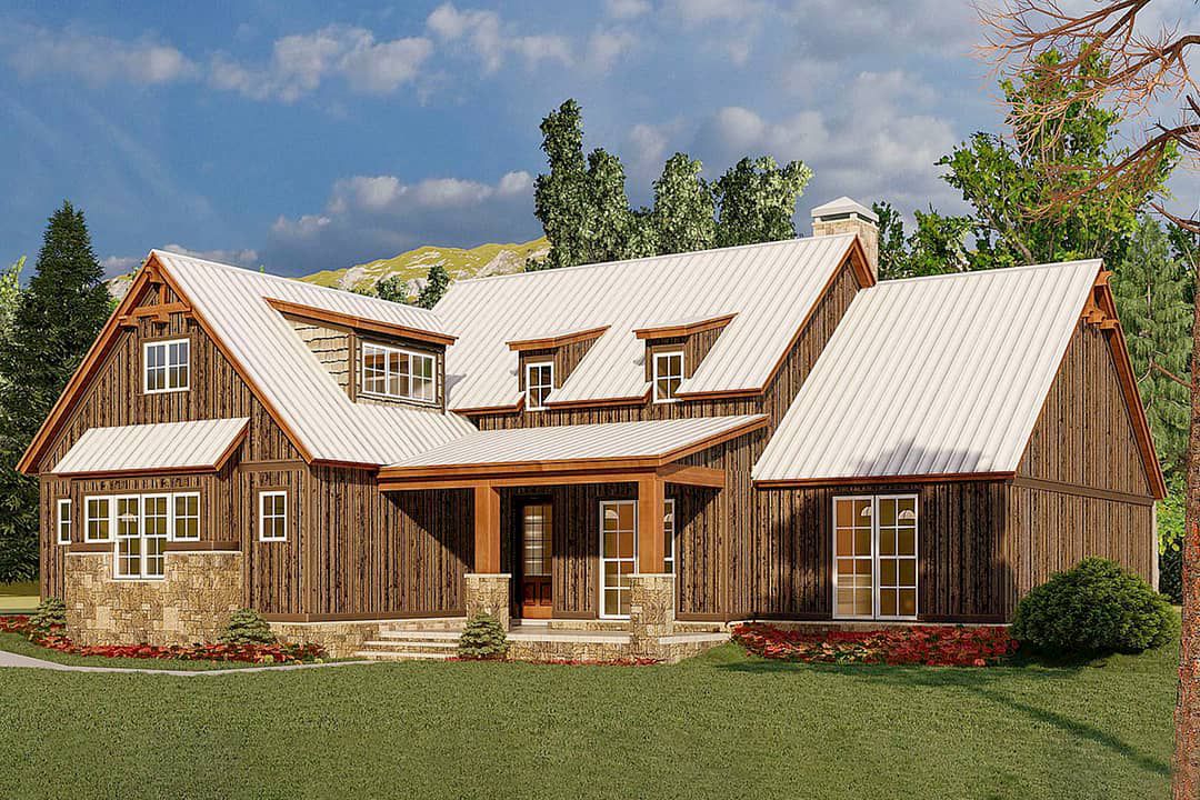 The home features board-and-batten siding combined with stone accents—typical of mountain home aesthetics. Large windows and dormers punctuate the façade, bringing light and visual interest.