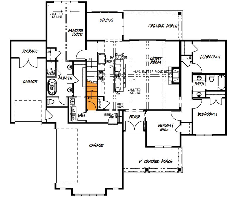 Entering from the front porch, you pass through a foyer that opens into a **vaulted great room** with exposed beams and a large stonework fireplace as focal point.