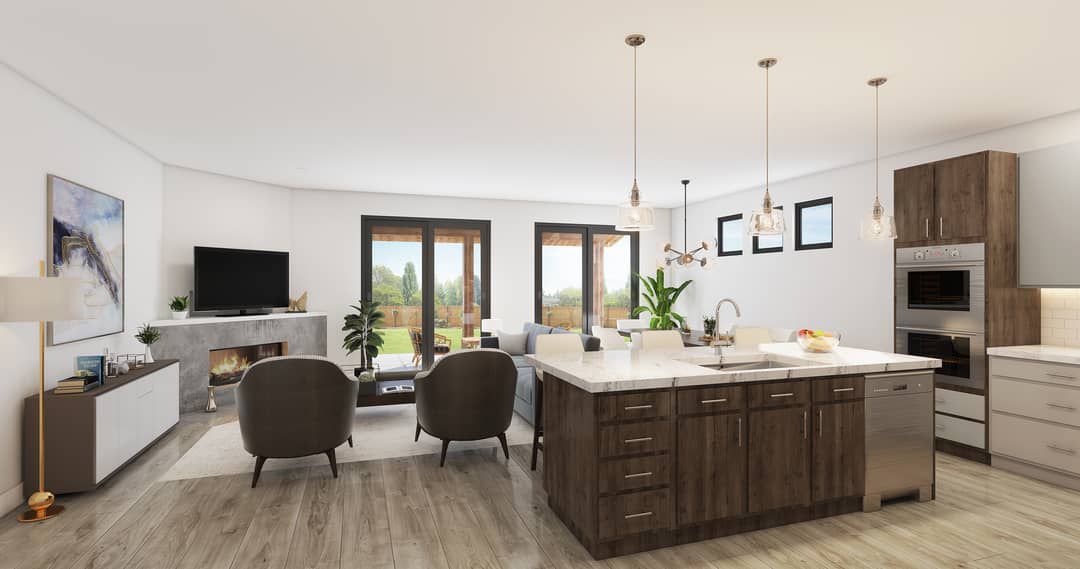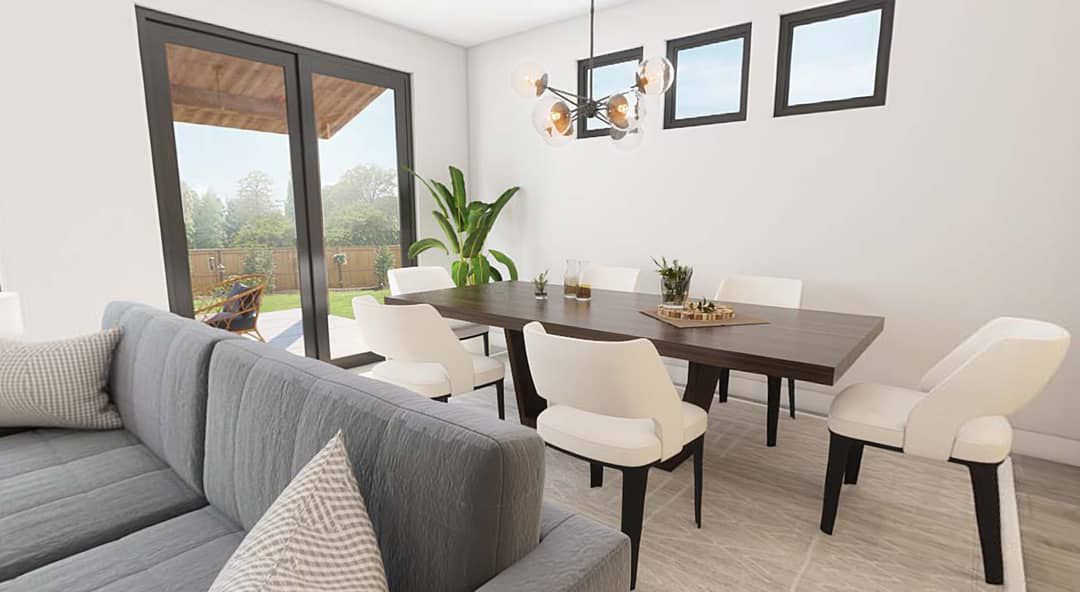 The living, dining, and kitchen zones are unified in an open layout, with sliding doors on two sides to integrate with exterior living.
