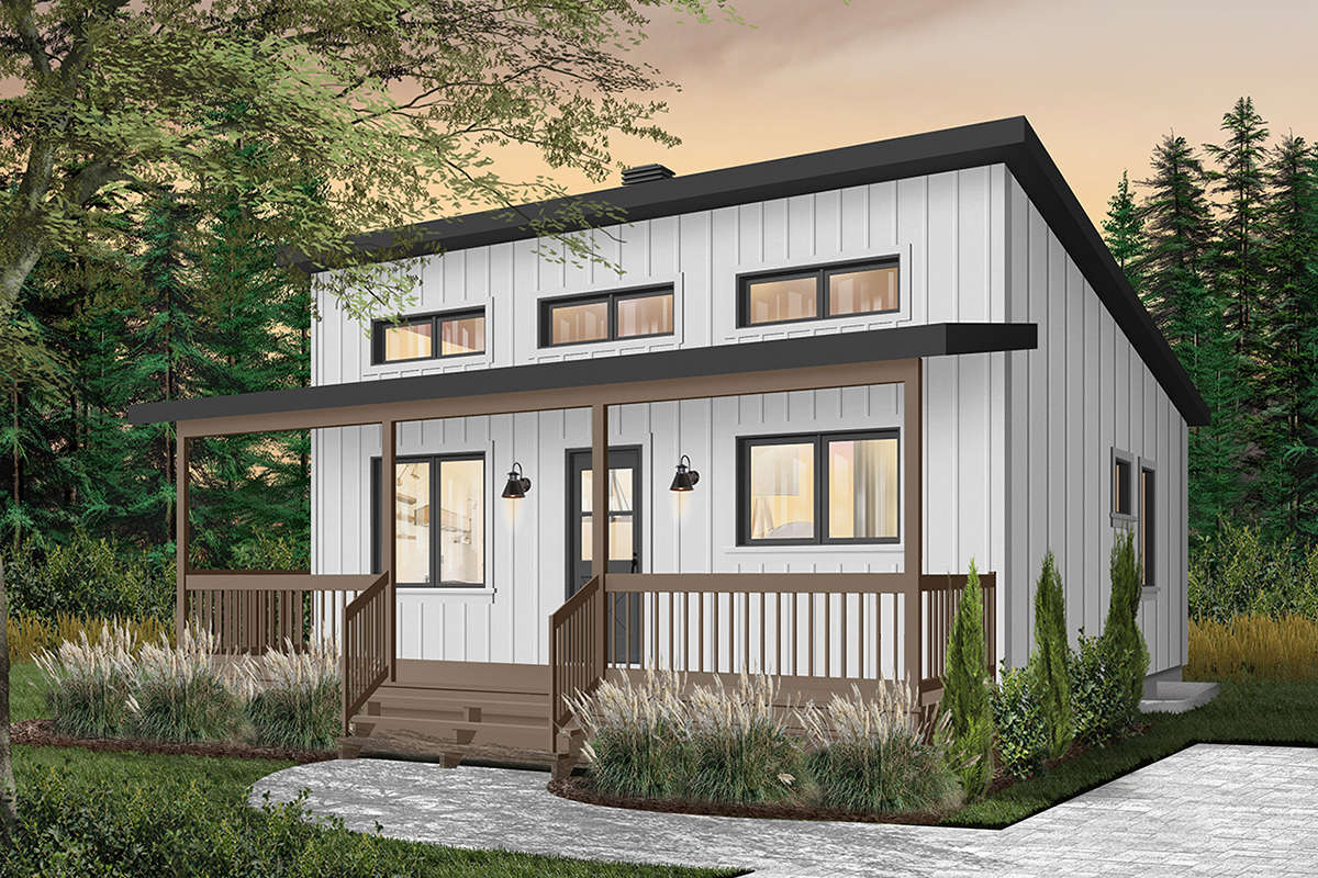 Plan 034-01120 offers a sweet and simple two-bedroom cottage design that maximizes its modest footprint. With an open living core, full front porch, and compact efficiency, it’s an excellent option for a getaway, guest home, or minimalist primary residence.