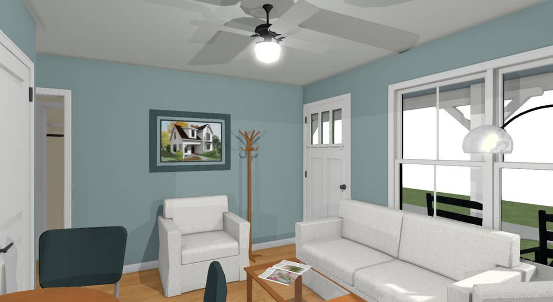 Entering via the front porch leads into an open living room with forward-facing windows. 