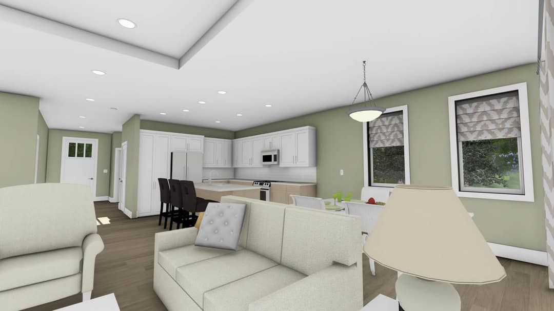 The open layout lets living, dining, and kitchen flow into one another without barriers.
