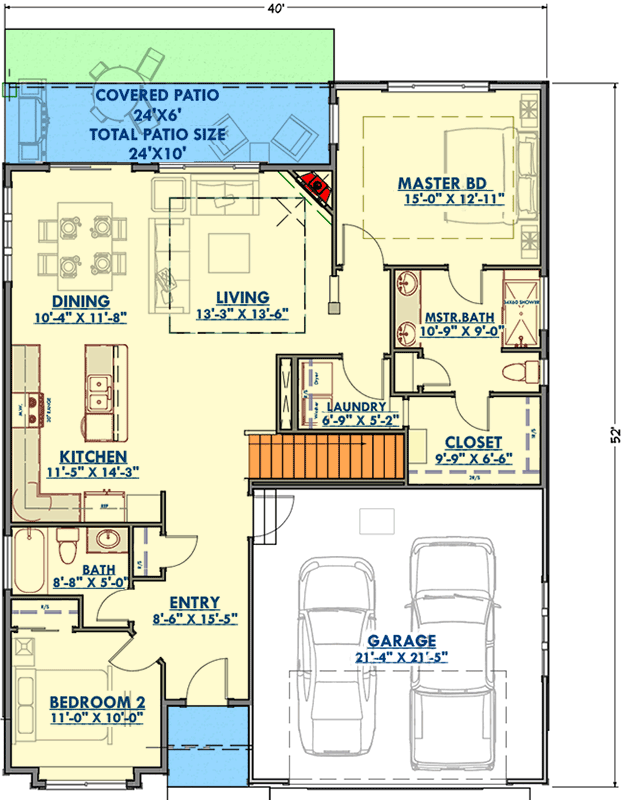 An **attached two-car garage (478 sq ft)** sits under the same roof, front-entry style.