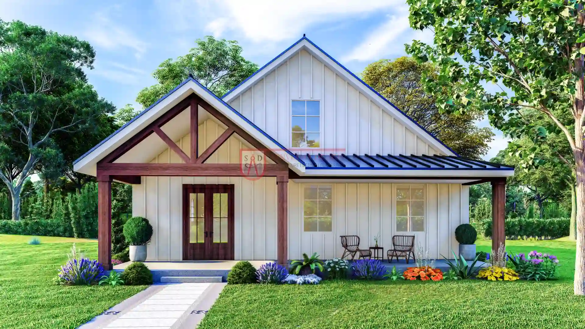 The exterior of this home embraces the classic modern farmhouse style with clean board-and-batten siding in a crisp white finish, accented by exposed timber beams on the front gable. A metal roof adds durability and a sleek contrast, while the wide front porch provides a warm and welcoming entryway.