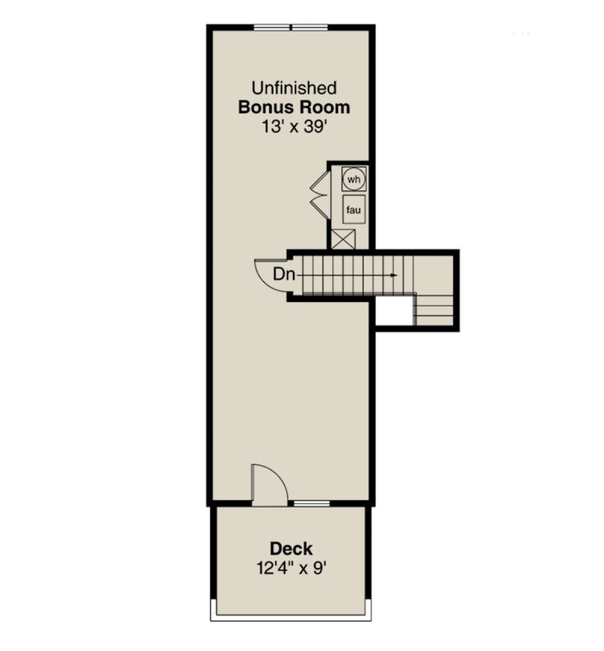 Upstairs, an **unfinished bonus room (approx. 540 sq ft)** includes a private deck (12′4″ × 9′) off that level, adding potential for expansion or guest space.