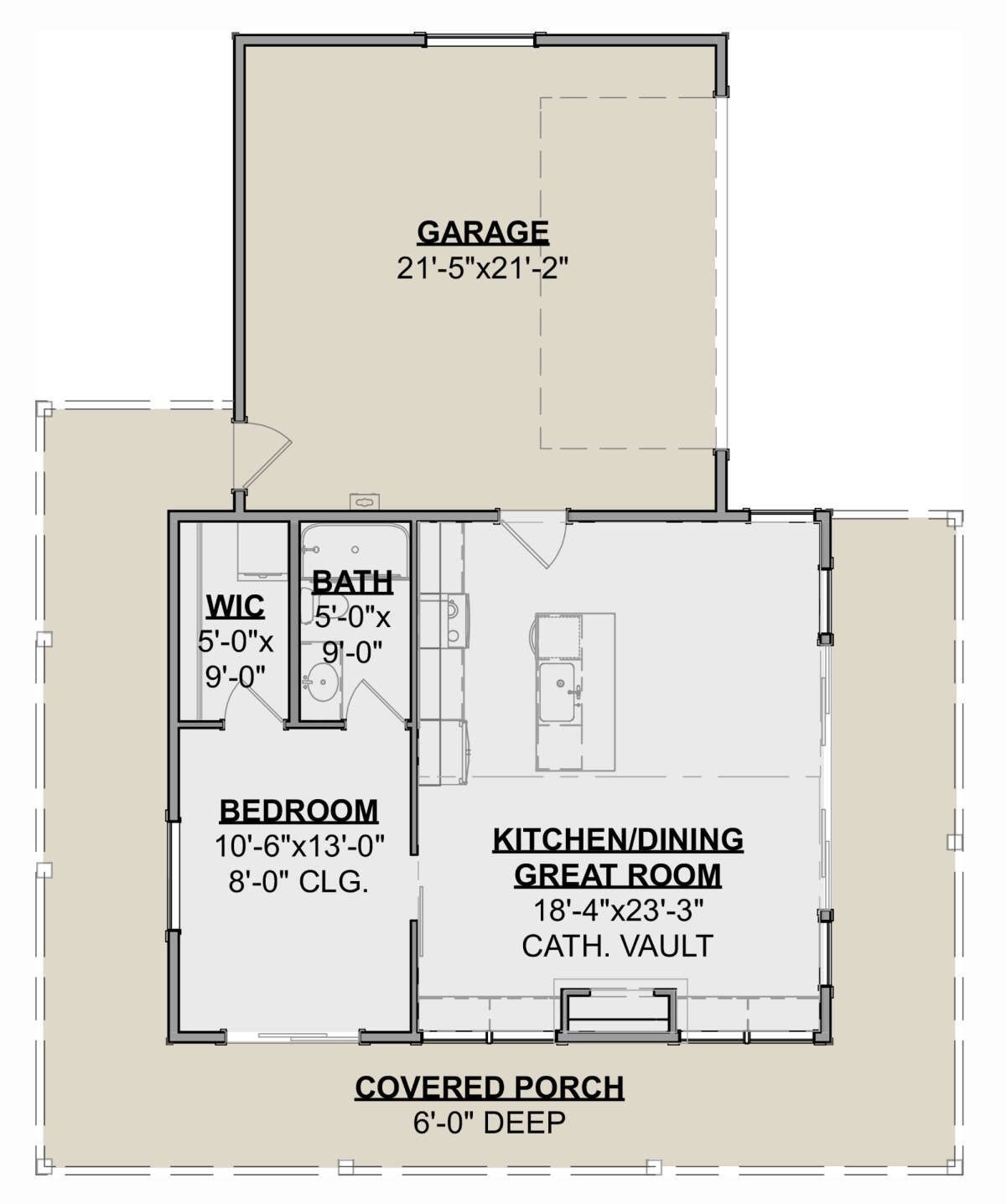 The published plan includes a **2-car garage (592 sq ft)**, detached or under separate roof.Storage is also provided via closets and cabinets within the small footprint.