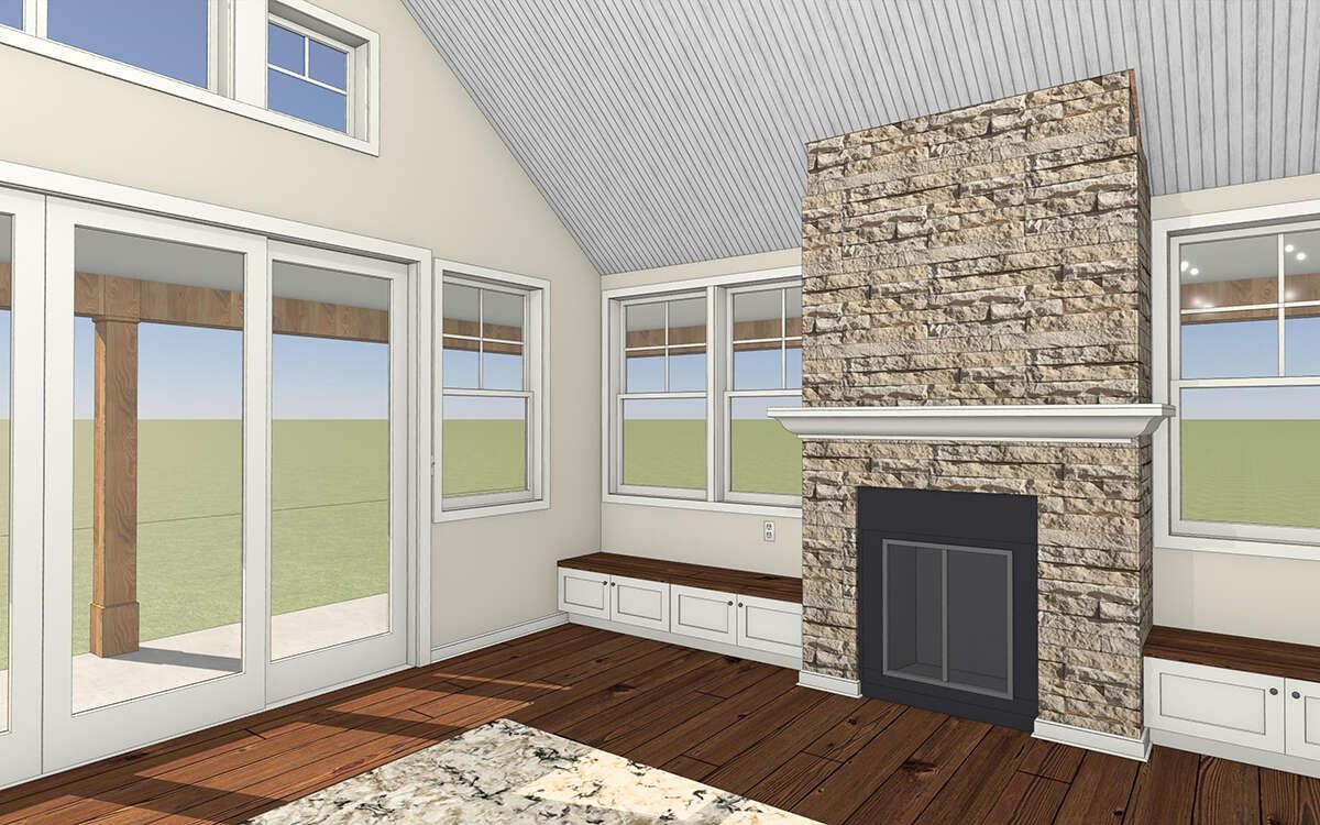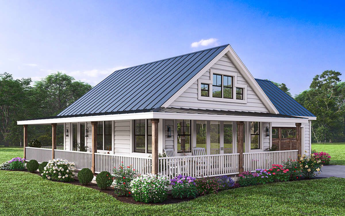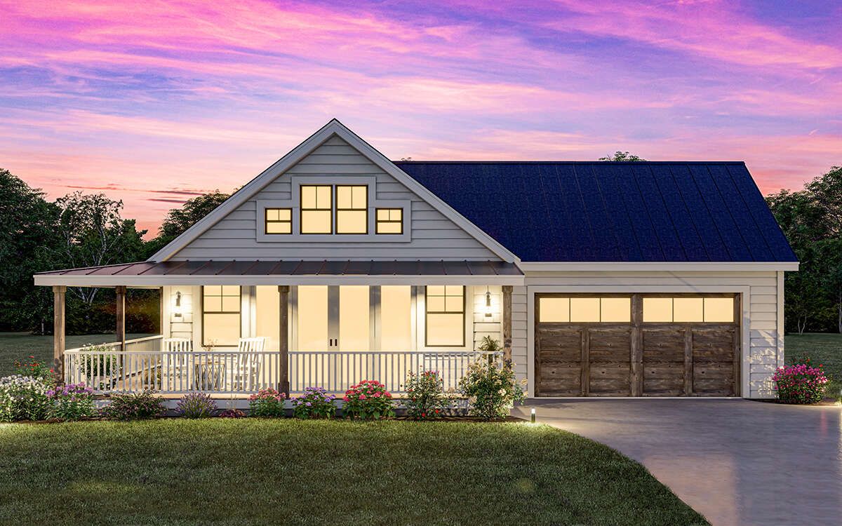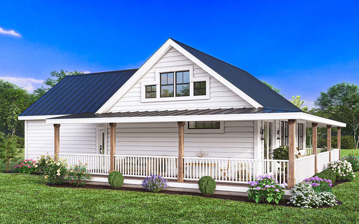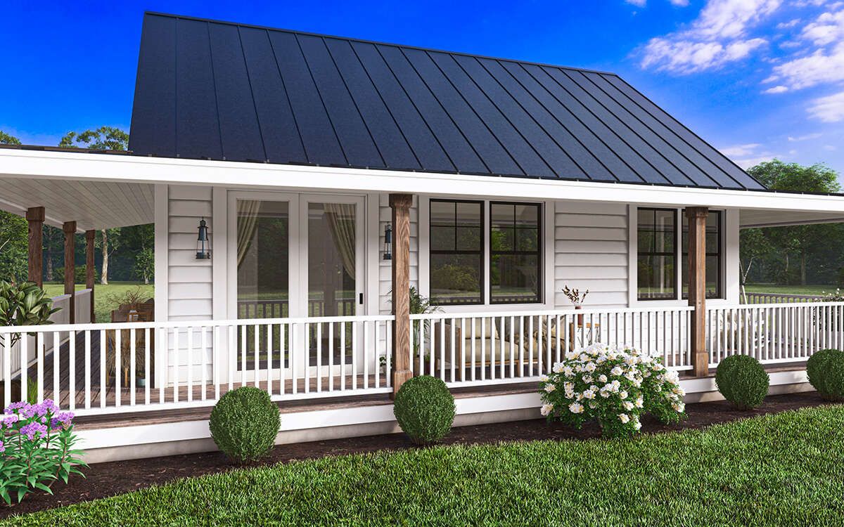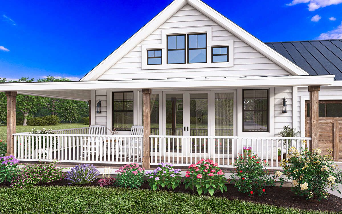 The prominent **front porch** gives a sheltered outdoor area and enhances curb appeal. The wide facade-to-porch relationship helps blend the interior and exterior visually.