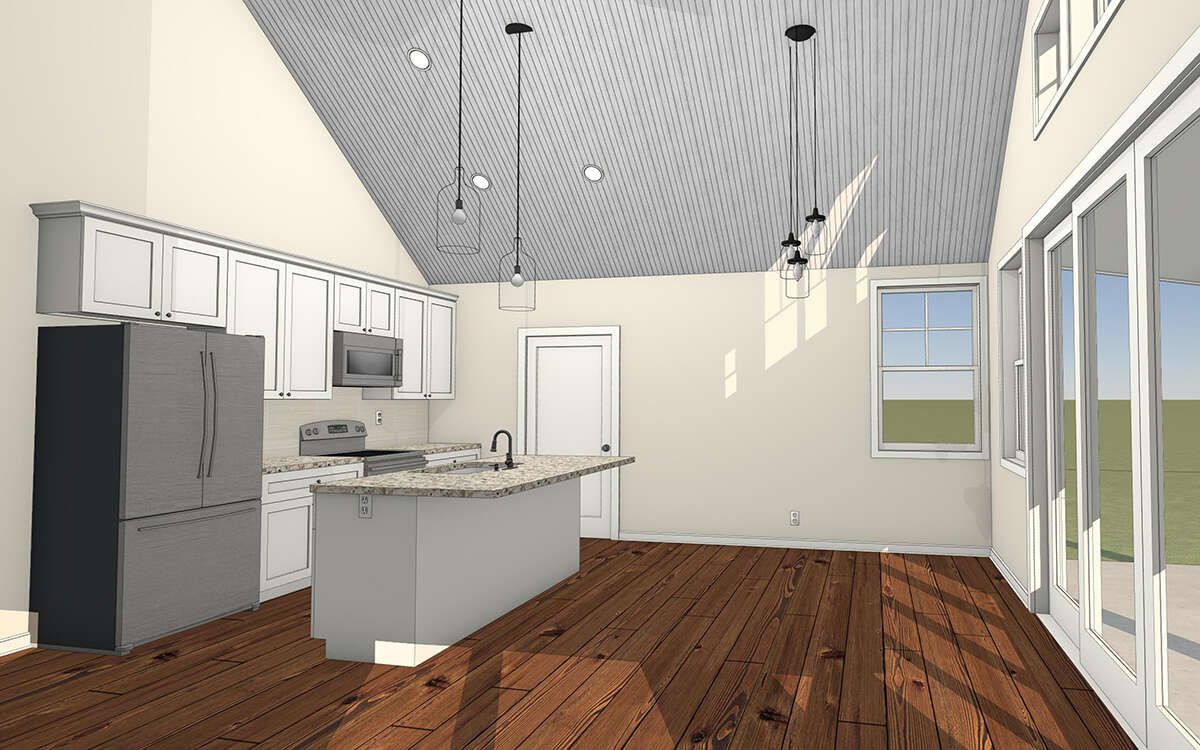 The kitchen is efficient and integrated into the open core, with cabinetry and counters arranged to serve both dining and living zones. Though details of appliances/counter layouts aren’t fully published, the design supports ease of movement and openness.