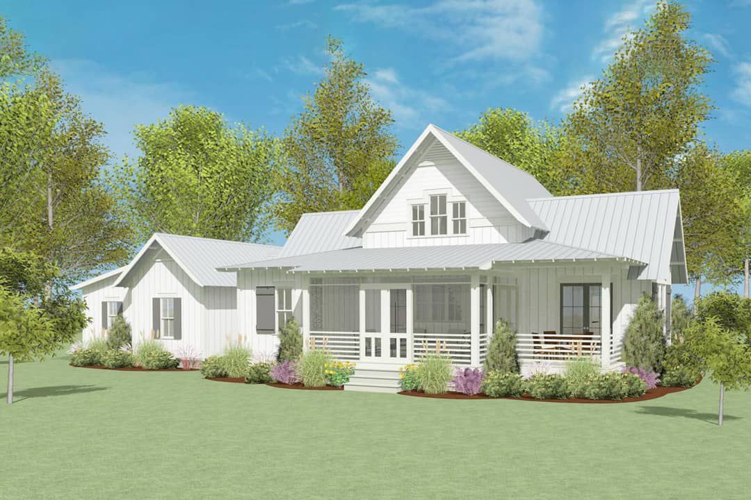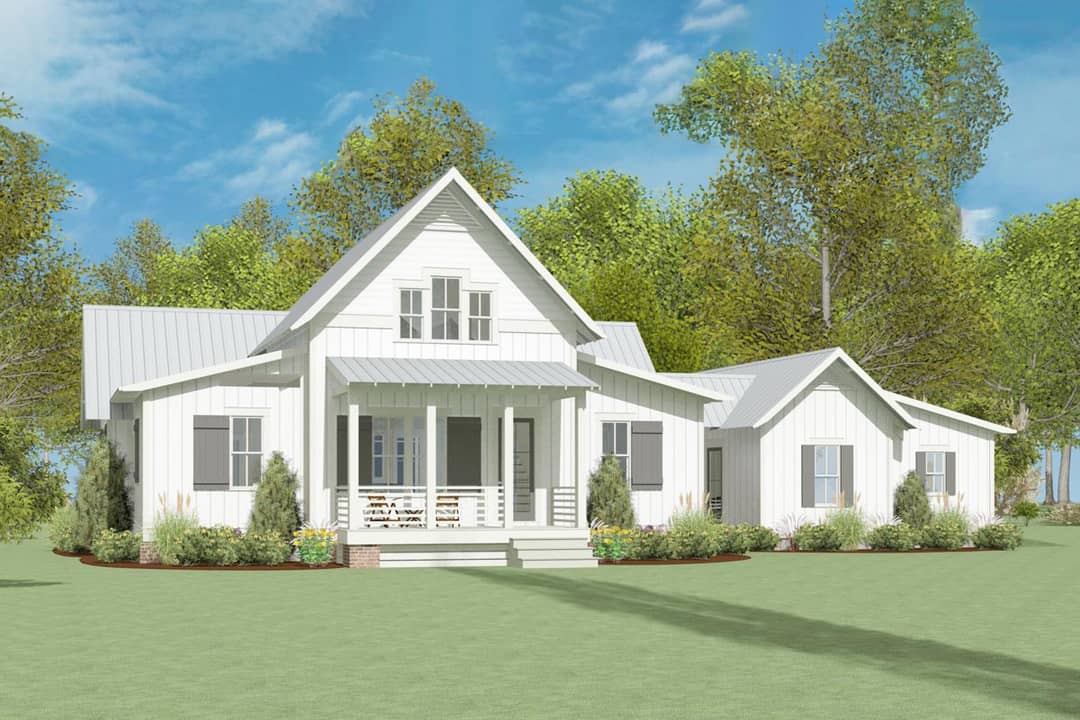 Board-and-batten siding, shutters, and a standing-seam metal roof elevate curb appeal. A shed roof over the front porch softens the lines and adds visual interest.