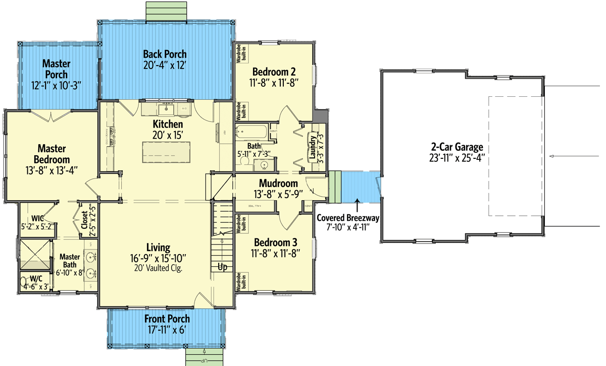 This plan blends modern farmhouse styling with practical spatial separation via a breezeway that links the home to a side-entry garage.