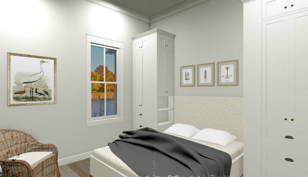 The two secondary bedrooms share a hall bath. The front-facing room can alternatively serve as a den, office, or guest space.