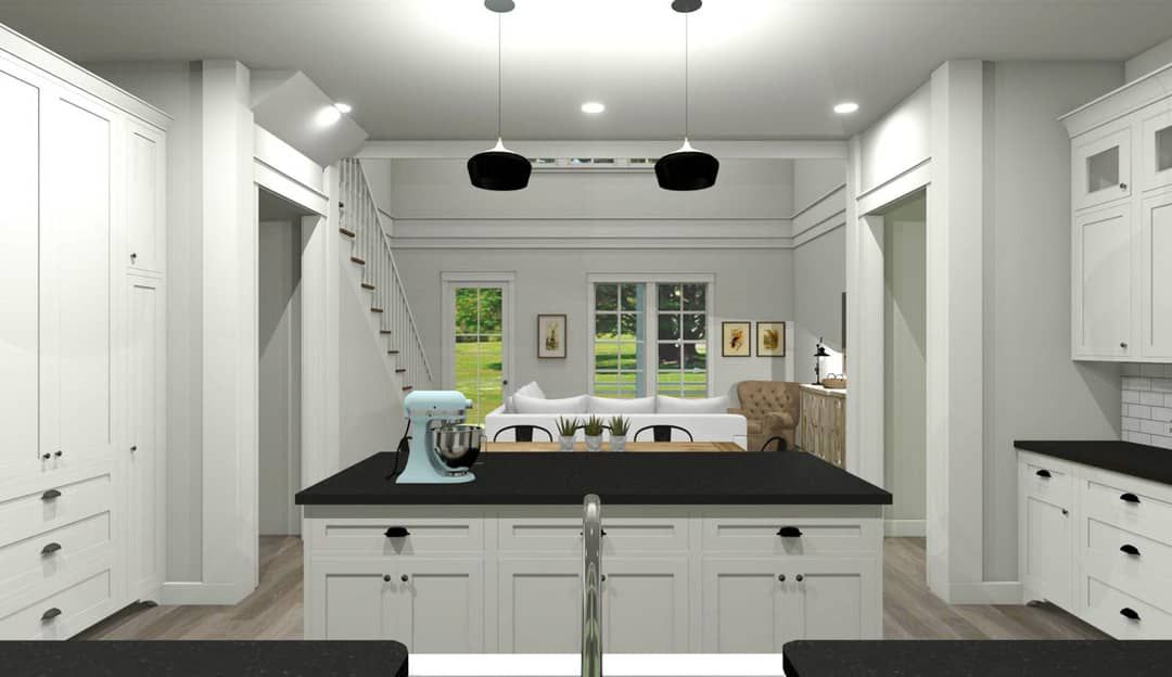 The kitchen includes a large island for prep and informal dining. It fronts toward both the living and dining zones, making interaction easy.