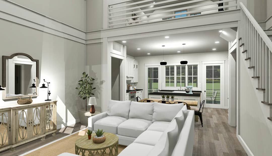 The vaulted living room is a dramatic focal point, drawing attention to height and openness.