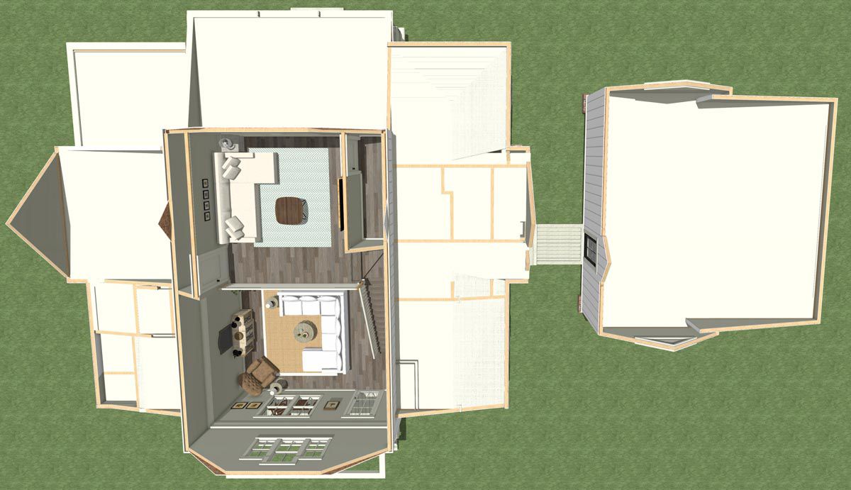 The loft’s view into the living area adds drama and visual connection to the home’s core.