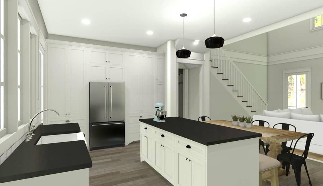The kitchen centers on a large, multifunctional island—prep station by day, snack bar by afternoon, and the world’s most popular gathering spot by evening. A walk-in pantry keeps countertop clutter to a minimum, while a window over the sink frames views to the rear porch (and keeps the dishwashing DJ properly inspired). Ample base and wall cabinetry, a logical appliance triangle, and direct access to the mudroom check the “daily efficiency” box in style.