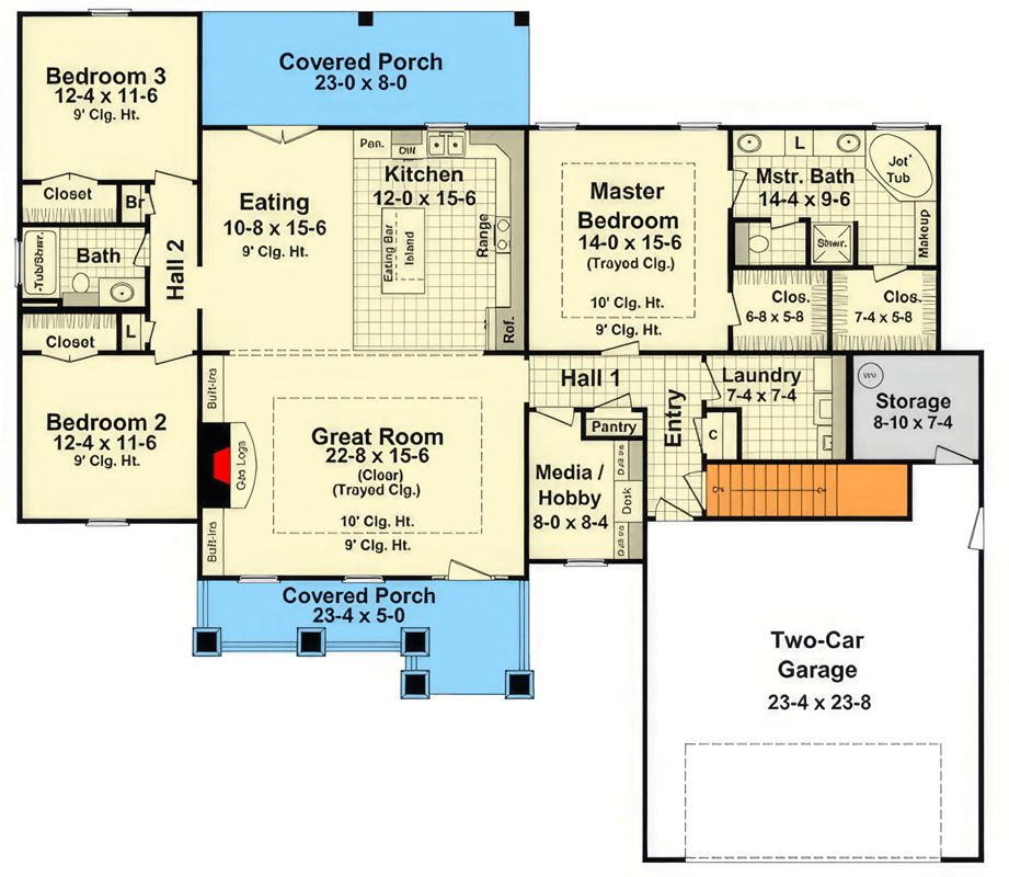 Why this plan works: classic Craftsman looks, a privacy-smart split-bedroom arrangement, and an open central core that lives big every day. Add the pair of covered porches and the hardworking mudroom, and you’ve got a home that’s as livable as it is lovely—form, meet function (and yes, you may be seated on the porch swing now).