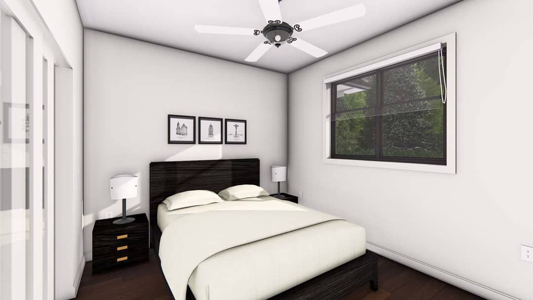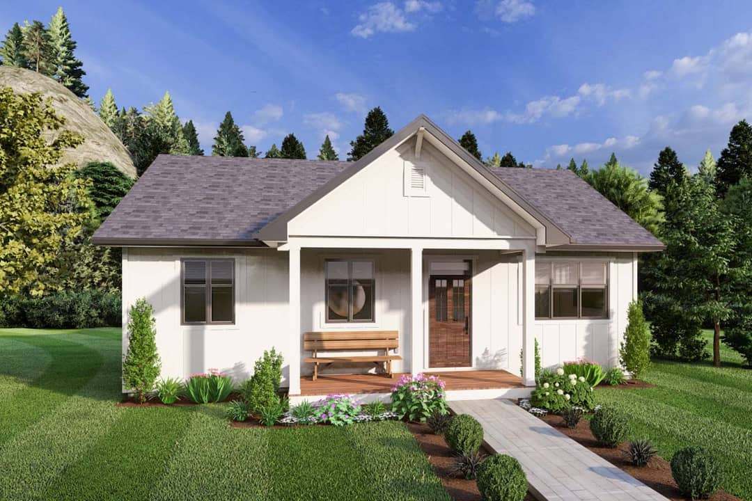 At 936 sq ft, this is a home that doesn’t pretend to be large—it embraces smart design instead. The open core layout preserves visual space, while the positioning of bedrooms maximizes privacy. The dual porches add a touch of outdoor living without overreaching. It’s a strong candidate for a first home, ADU, or for downsizers who value simplicity and efficiency.