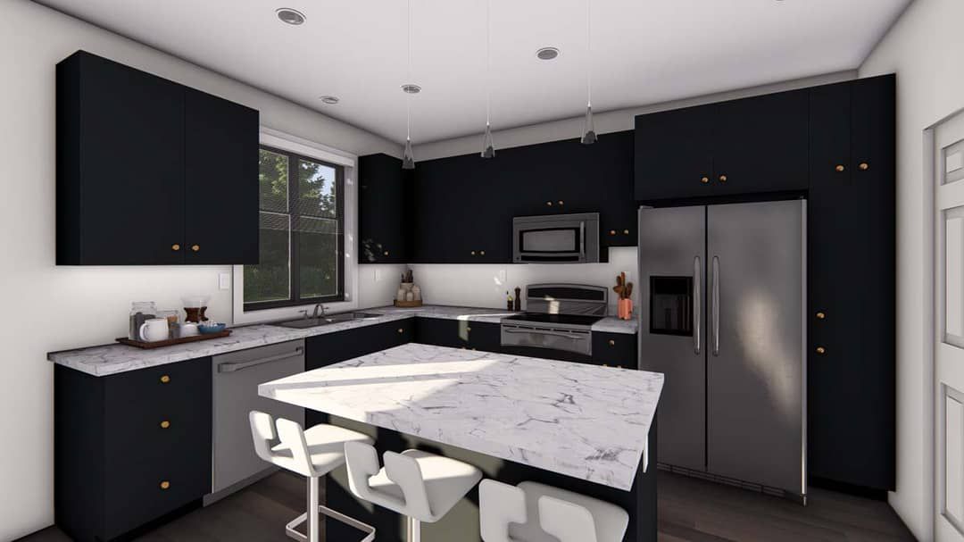 The open living/dining/kitchen area spans much of the front width of the home. In the images, you can see how light from multiple elevations helps the space feel more expansive than its footprint.