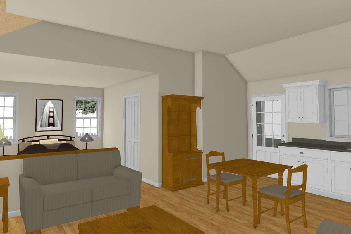 With just about **538 square feet**, this is a true compact home design. The interior is organized carefully to maximize every inch. The main living area likely flows from entry through living into the kitchen/dining zone, with minimal walls to keep the space open and airy.