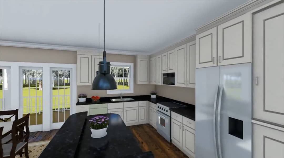 The living room is the social core, sized to host comfortable seating, perhaps a small loveseat and chairs. Windows at the front bring in light and help visually expand the area. Because there’s no formal “dining room,” the kitchen/dining zone shares space with the living, creating a multipurpose gathering zone.