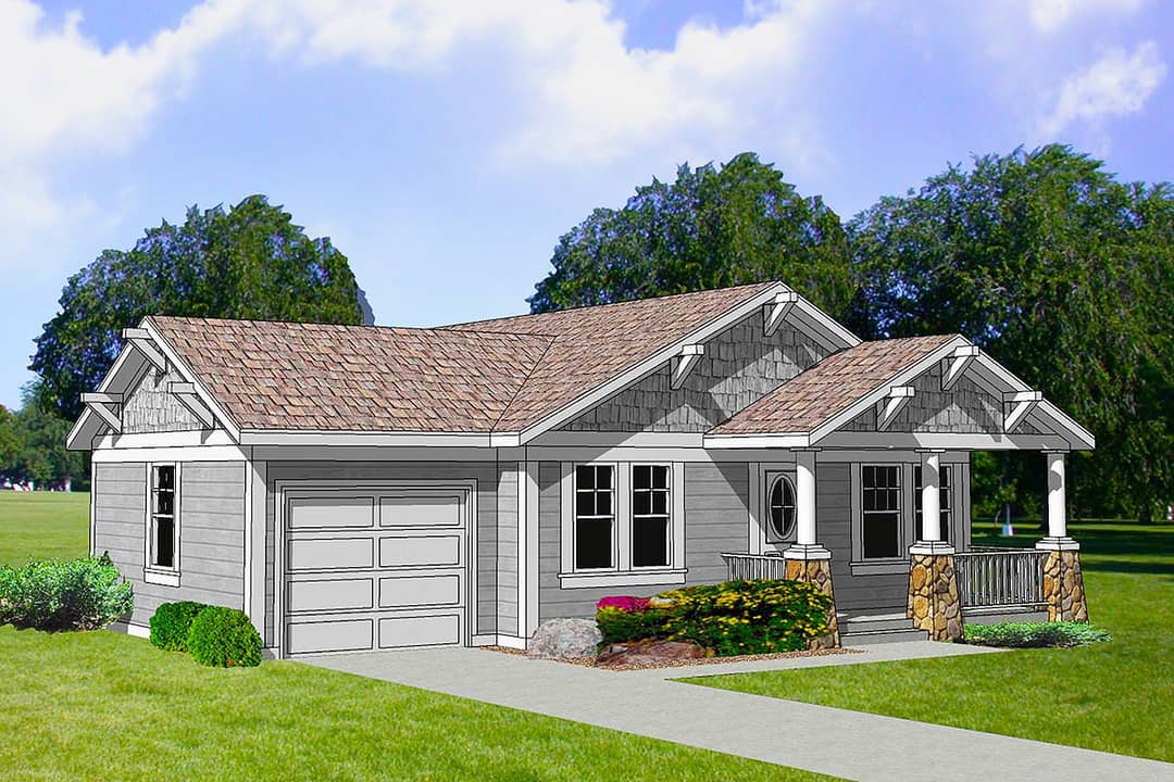 The roof is a simple gable design (pitch 6:12) that keeps construction costs down while still delivering visual interest. 2 A modest covered porch spans part of the front, offering a welcoming entry and outdoor seating zone.