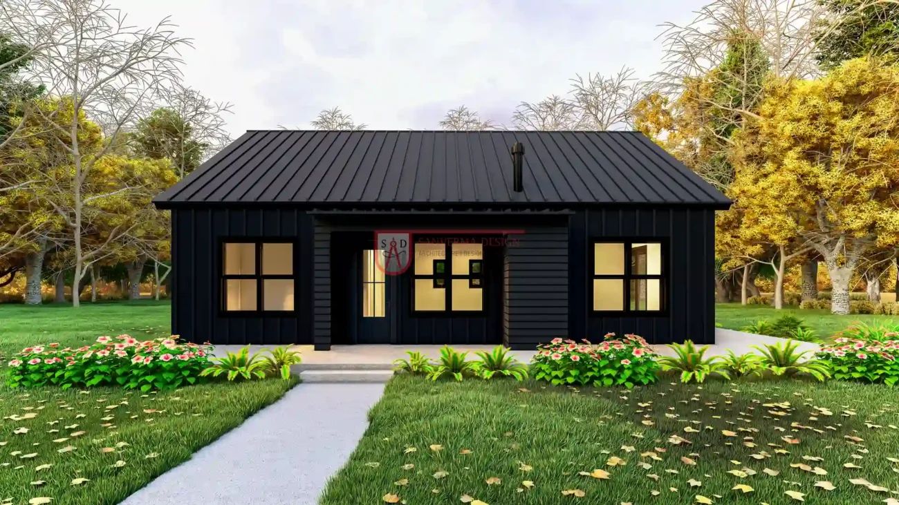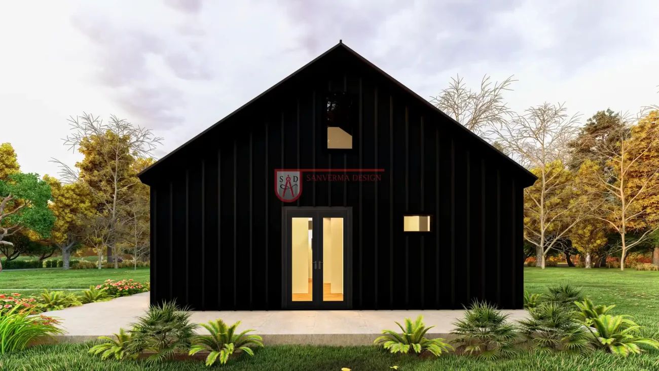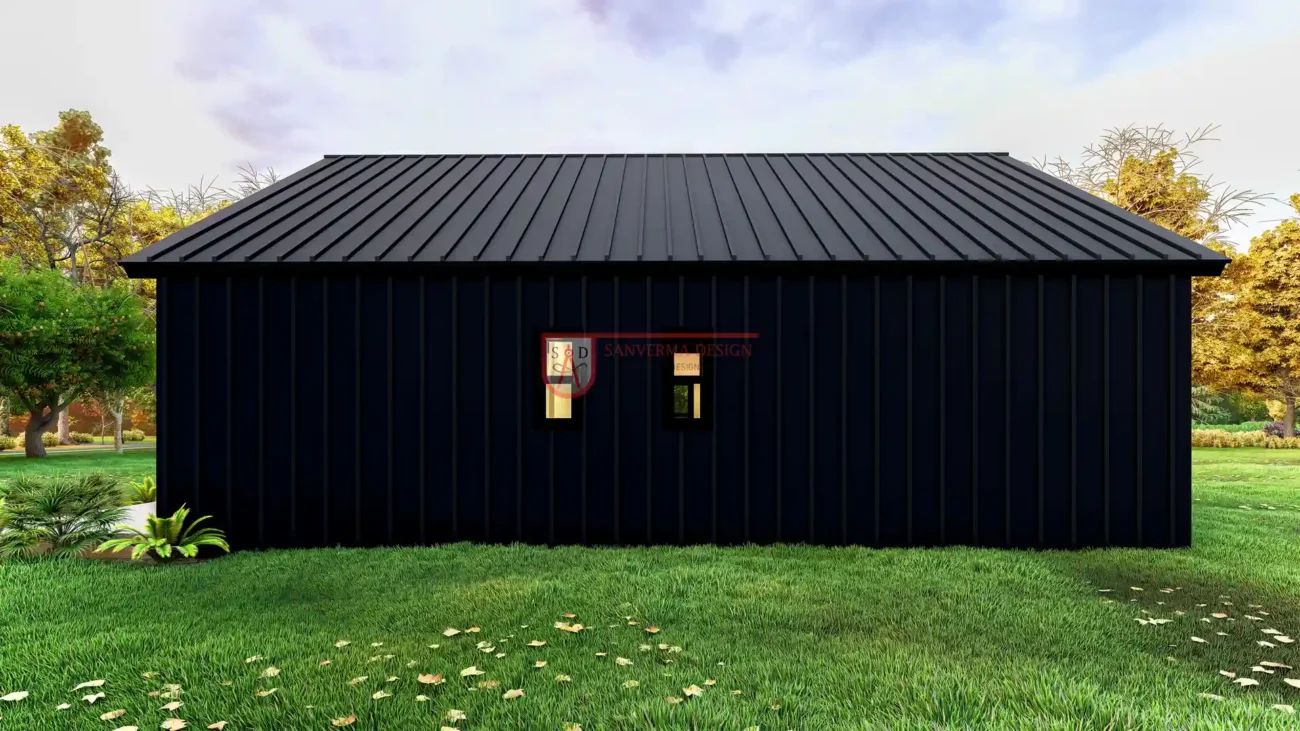 The exterior reads crisp and contemporary: vertical board-and-batten cladding, a low-maintenance metal roof, and simple trim that frames deep, black-gridded windows. The silhouette is a clean gable volume with modest eaves, keeping water off the walls while maintaining a tidy modern profile. A full-width front deck (approximately 48′ x 8′) creates a welcoming approach, and a secondary side deck (about 8′ x 30′) extends daily life outdoors. The overall vibe is “farmhouse meets minimalist cabin”—warm, durable, and easy to keep looking sharp.