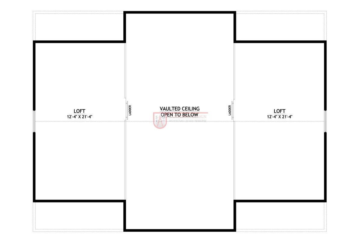 Up top, twin loft bays (each about 12′-4″ x 21′-4″) flank the central vaulted void that’s open to the living room below. Accessed by ladders, these lofts are ideal for guest bunks, gaming zones, studio space, or dry storage. Finish one now and leave the other raw, or keep both open and airy—your call. Because the main roof volume already exists, finishing the lofts is a cost-effective way to gain useful square footage without pushing the footprint.