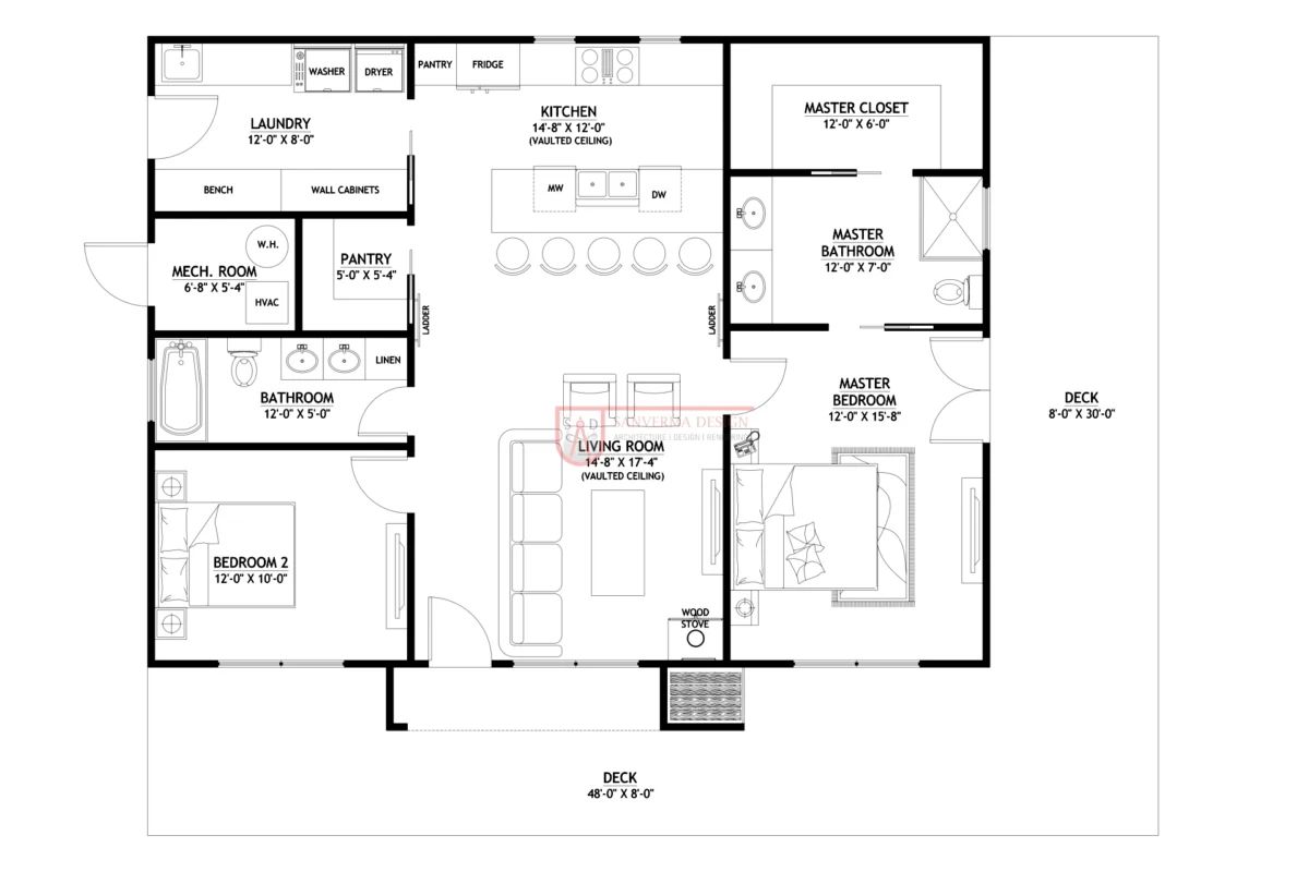 Step into a vaulted living room (about 14′-8″ x 17′-4″) anchored by a cozy wood stove. Sightlines run straight through to the kitchen, so gatherings feel connected. Circulation is simple and compact: sleep zones line one side, service spaces the other, with minimal hallway. Utility rooms—mechanical, pantry, linen, and a true laundry/mud zone—sit on the back of the plan where they belong, keeping noise down and chores contained.