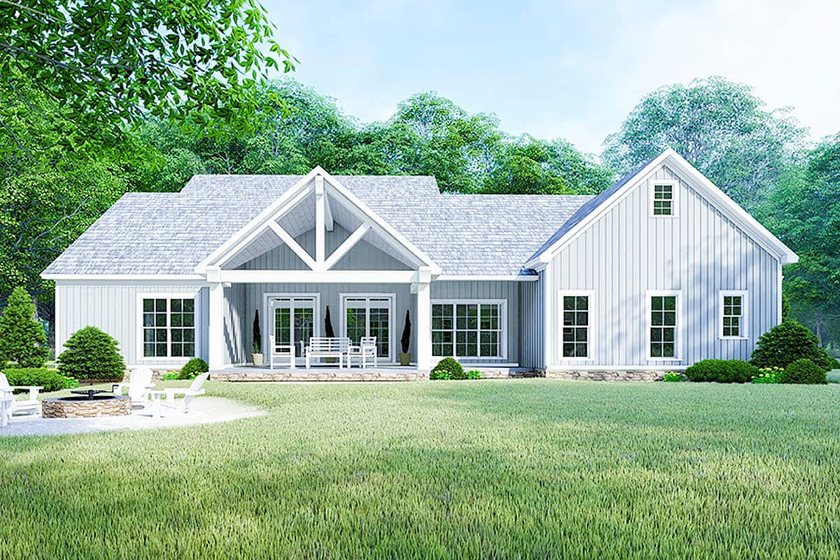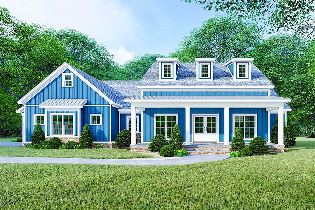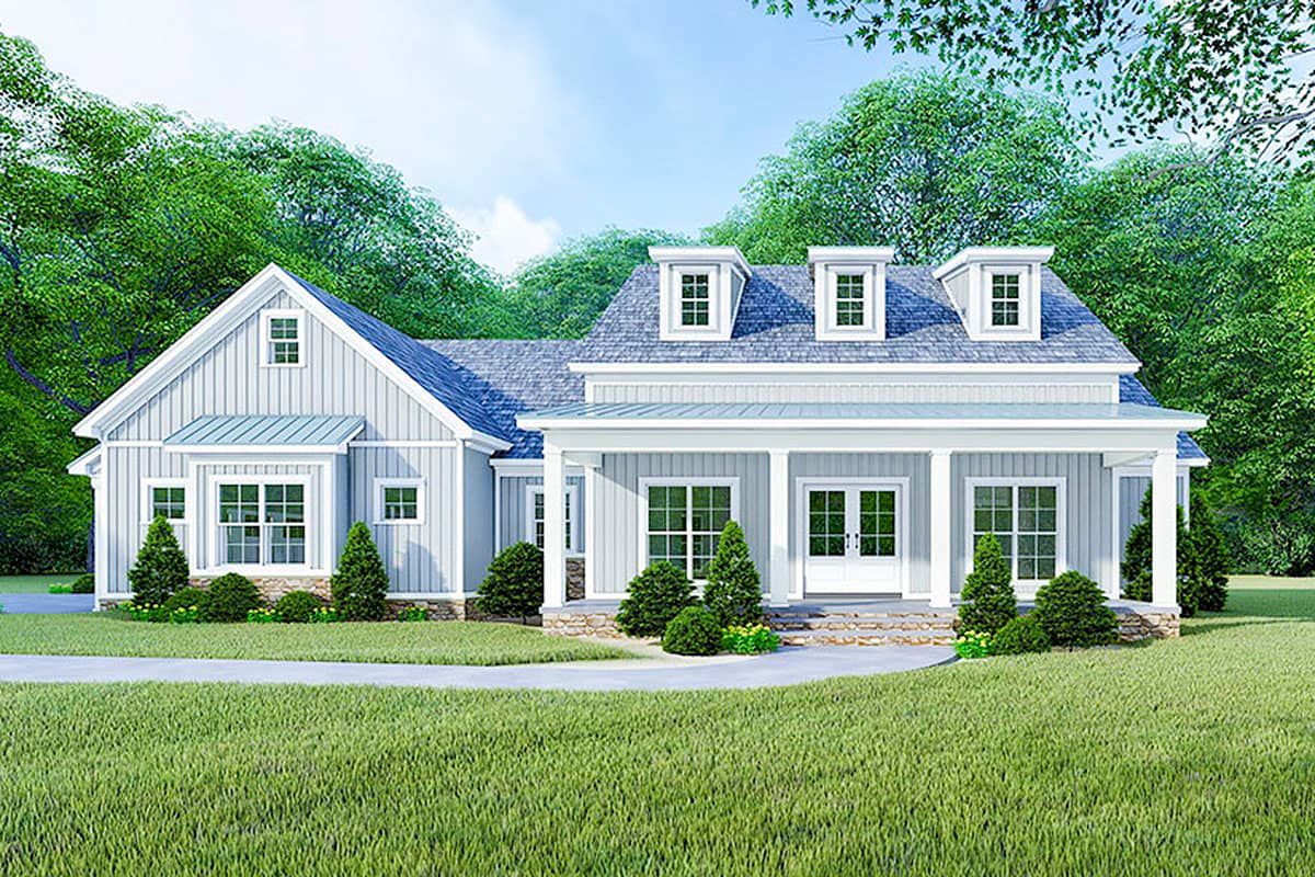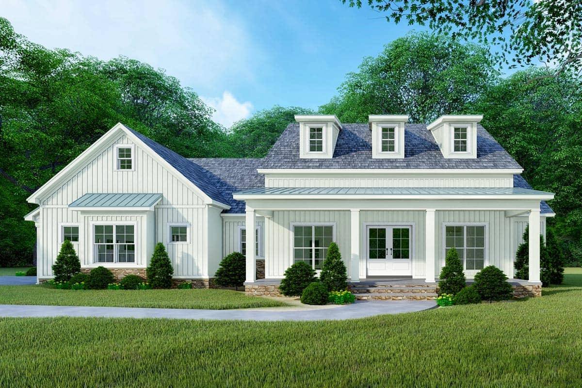The curb appeal leans classic-modern: board-and-batten siding rises above a brick skirt which grounds the house visually and adds texture. The welcoming front porch is flanked by dormers and large windows that bring a friendly, open feel. 2 Roof pitches are straightforward, and the overall form keeps complexity moderate—helping manage cost while delivering strong style.