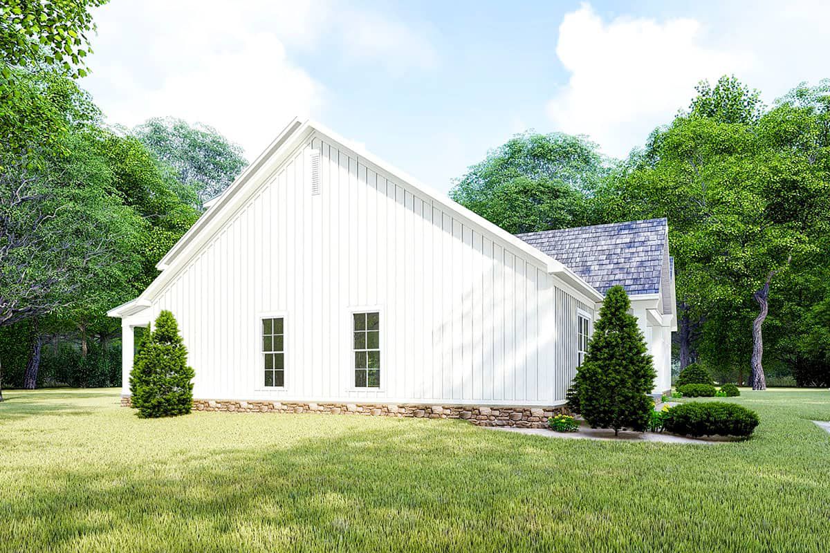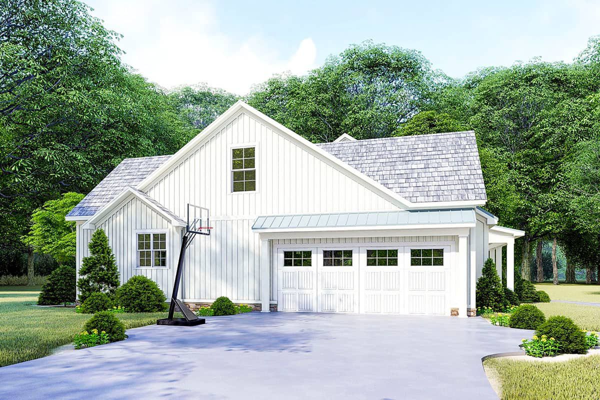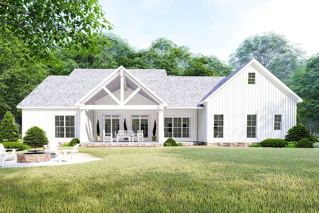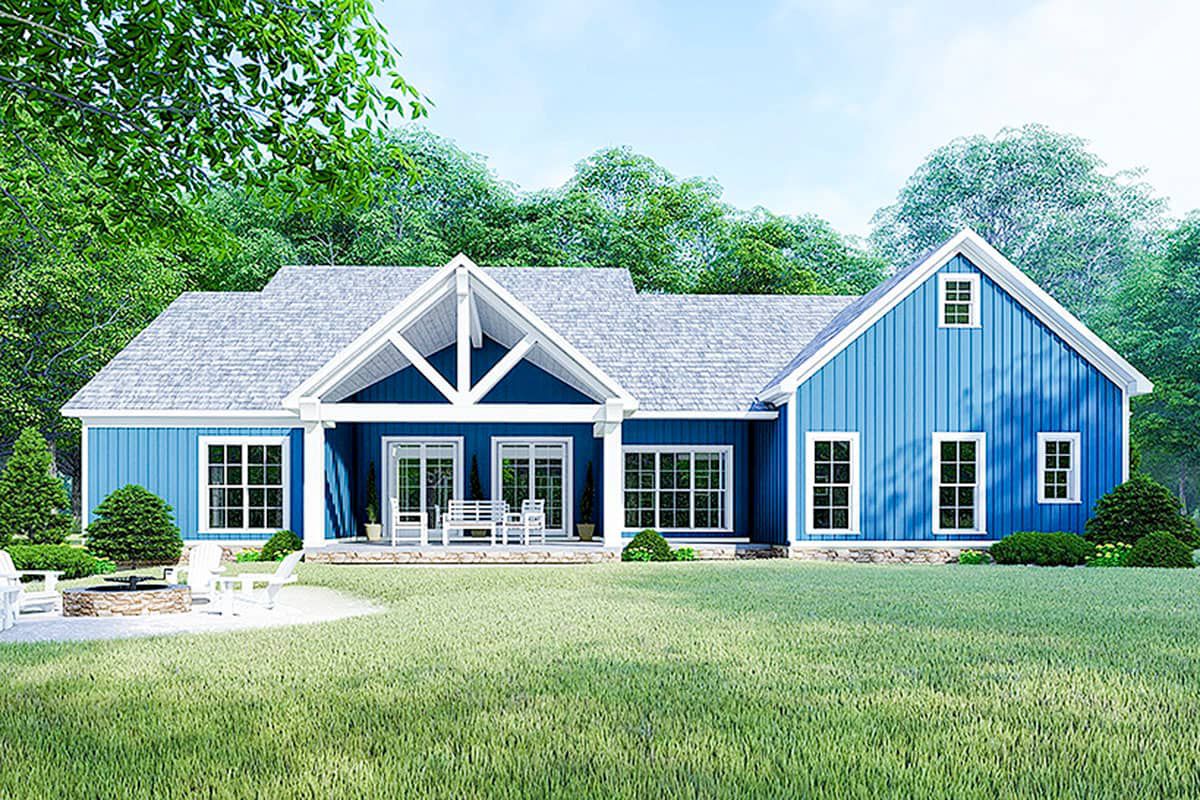 The curb appeal leans classic-modern: board-and-batten siding rises above a brick skirt which grounds the house visually and adds texture. The welcoming front porch is flanked by dormers and large windows that bring a friendly, open feel. 2 Roof pitches are straightforward, and the overall form keeps complexity moderate—helping manage cost while delivering strong style.