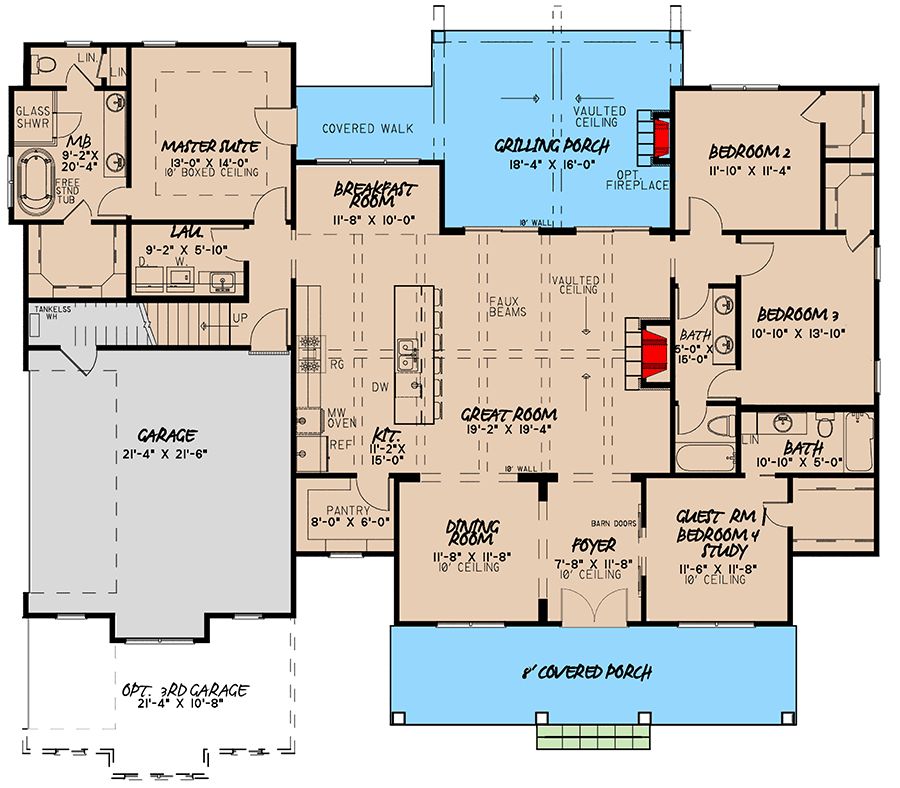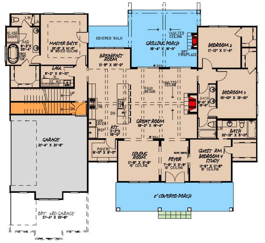 The main level includes a formal foyer with 10′ ceilings, a den/guest room with ensuite bath, and a formal dining room. The great room, kitchen, and breakfast nook flow together under a vaulted ceiling complemented by exposed timber beams. On one side sits a master suite with boxed ceiling, freestanding tub, glass shower, dual vanity, and walk-in closet. Across the home, two secondary bedrooms each with walk-in closets share a hall bath. Over the attached garage is an optional **432 sq. ft. bonus room** for added flexibility. 1