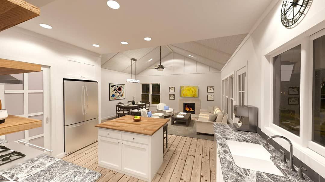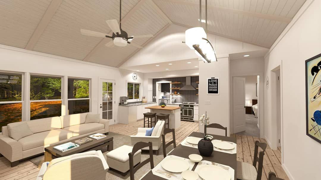 The standout feature is the vaulted great space combining living, dining, and kitchen—no walls holding back the light or view. From the vaulted ceiling down to the floor, all parts of daily life interconnect. Sliding doors lead out to the back porch, lengthening the view and giving indoor-outdoor access.