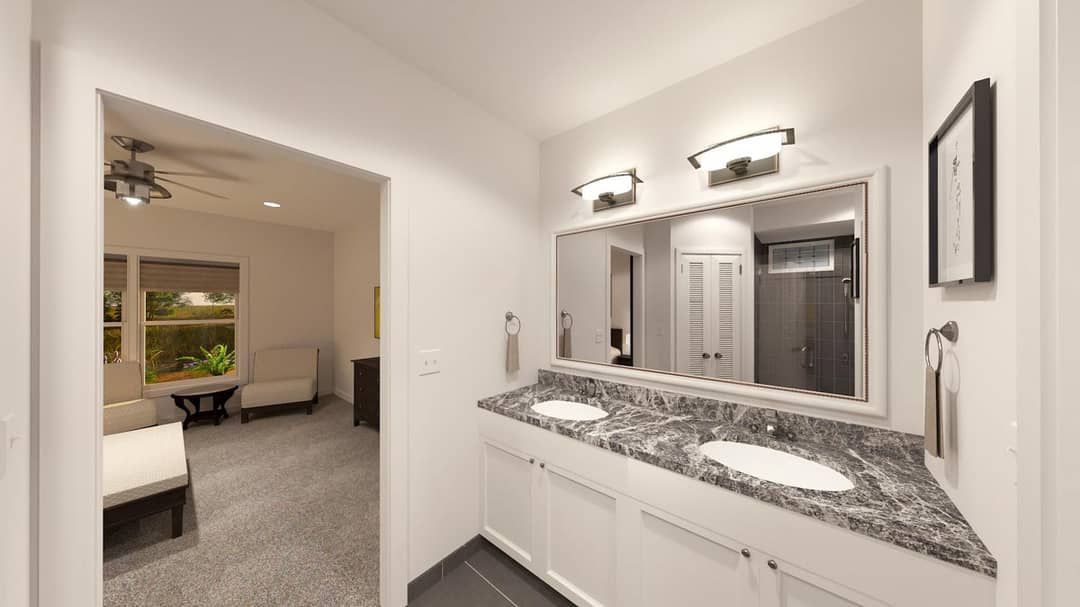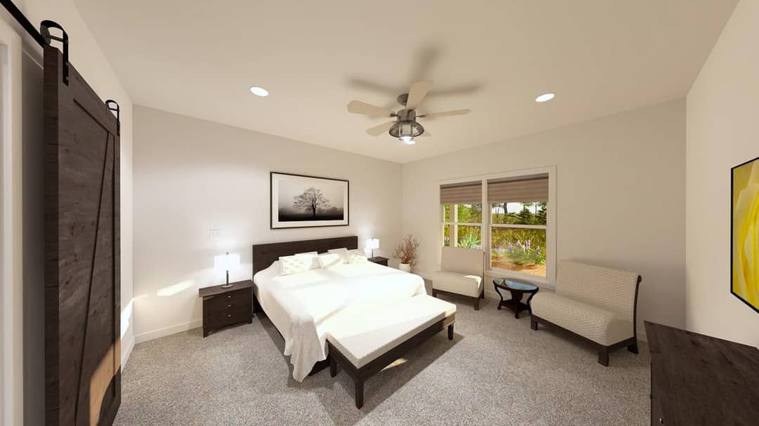 The **master suite** is a quiet retreat. It holds **dual walk-in closets**, and a barn door leads into a shared full bathroom, which also connects directly to the laundry room. This arrangement reduces traffic through the core and ultimately saves plumbing costs. 1