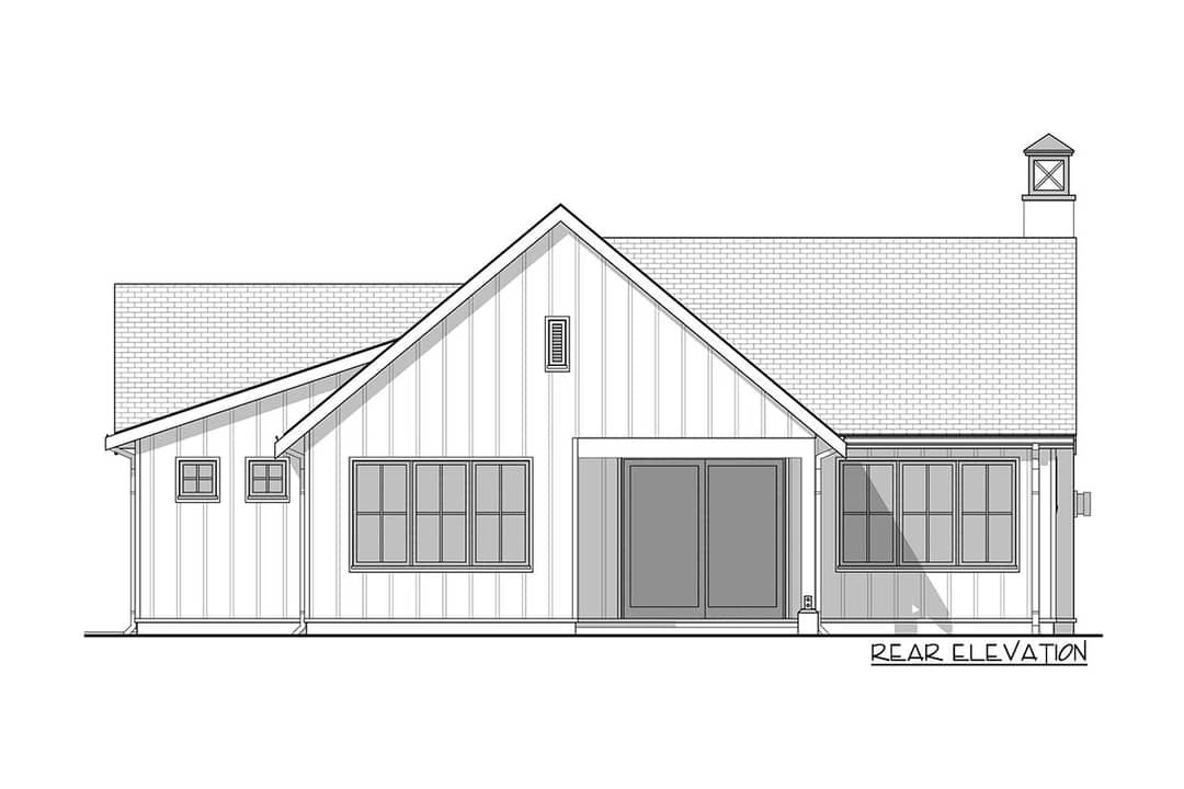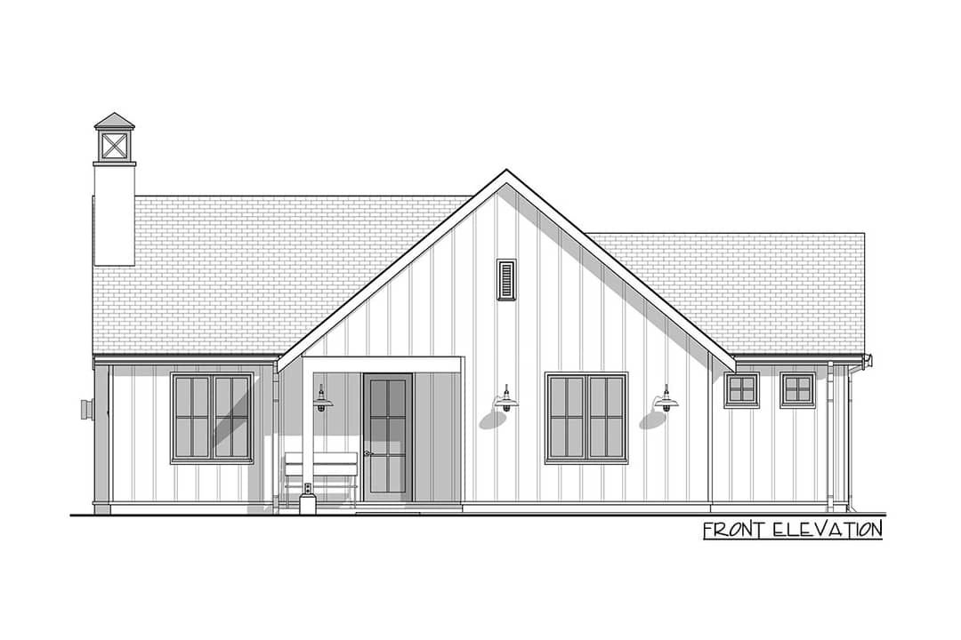This modern farmhouse design blends elegance and utility in a smaller package. The plan features a **board-and-batten exterior**, a cozy entry porch, and clean lines that hint at refinement rather than grandiosity. It includes an **attached two-car garage** with **side entries**, offering practical storage or workshop space.