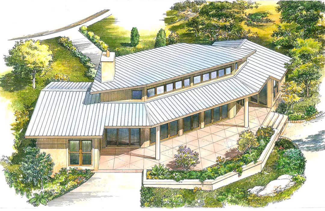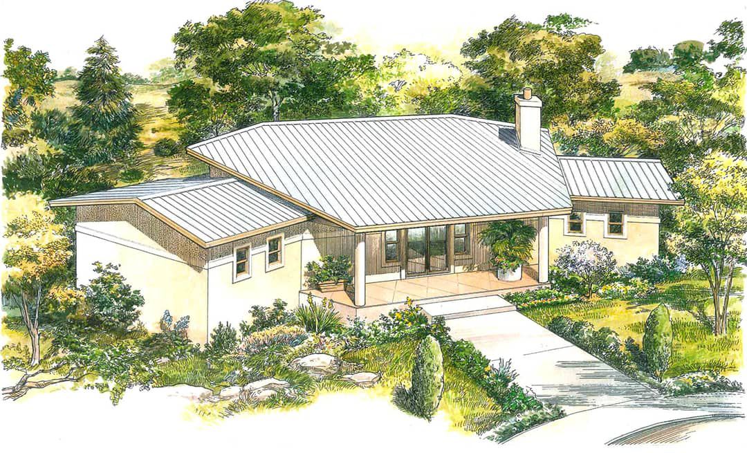 This contemporary retreat balances form and function with flair. The design delivers about 1,275 square feet of living space in a single story. It features a distinctive roofline (standing seam metal is an option) and an unusual, sculptural shape that enhances curb appeal.