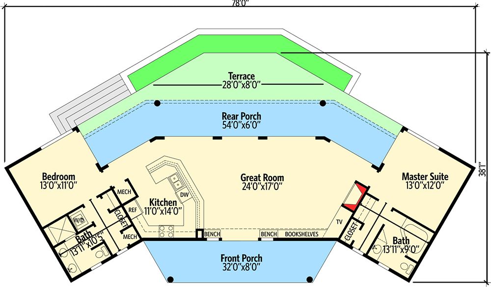 This is a retreat-style plan that surprises. The modest size belies its architectural ambition, with a vaulted living core, split bedrooms, and a strong indoor-outdoor connection. It’s ideal for someone who wants a bold design statement in a manageable form—smart, modern, and full of character.