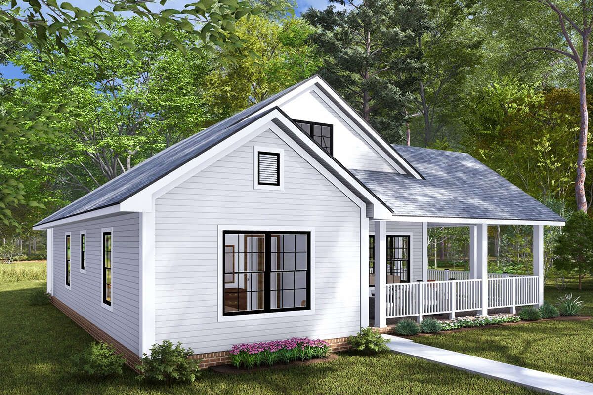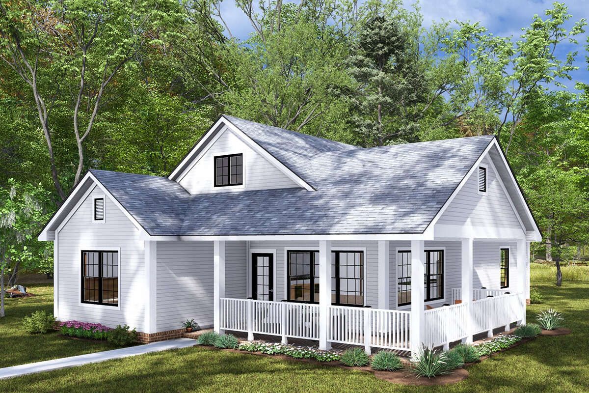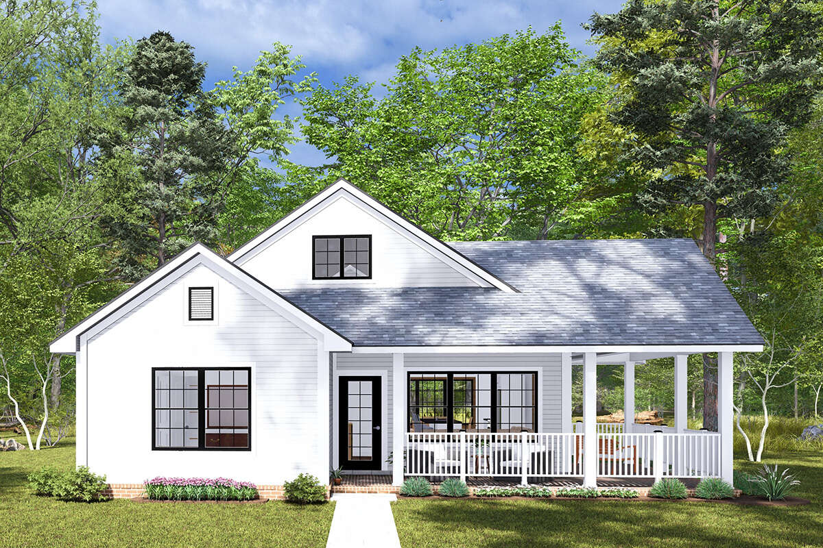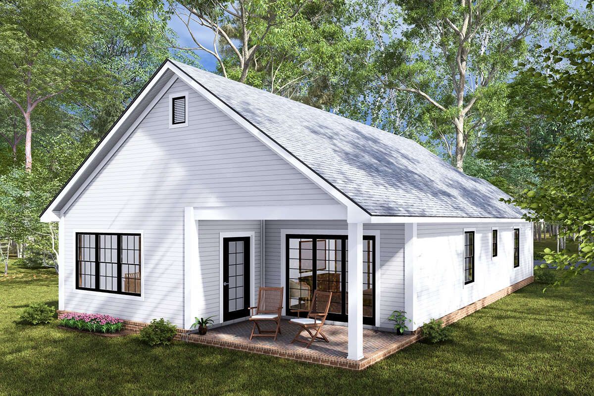 Despite its modest size, this country plan balances comfort, privacy, and aesthetic appeal. The split-bedroom layout gives separation of private zones. The central open living space remains spacious and sociable. Large porches front and rear extend your usable area without adding indoor cost. The plan’s shape, efficient systems, and simple roof make it both accessible and adaptable.