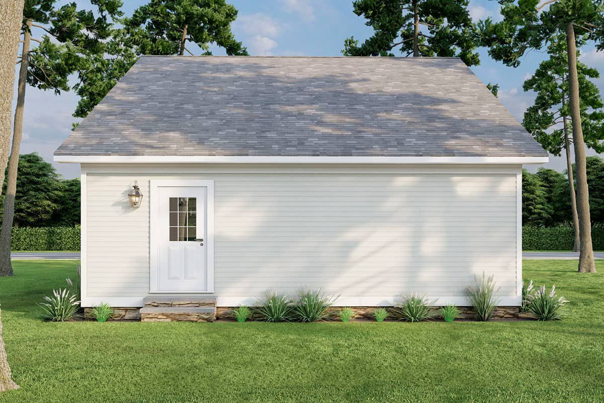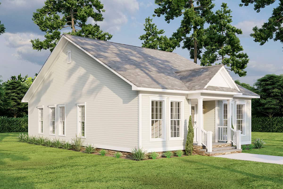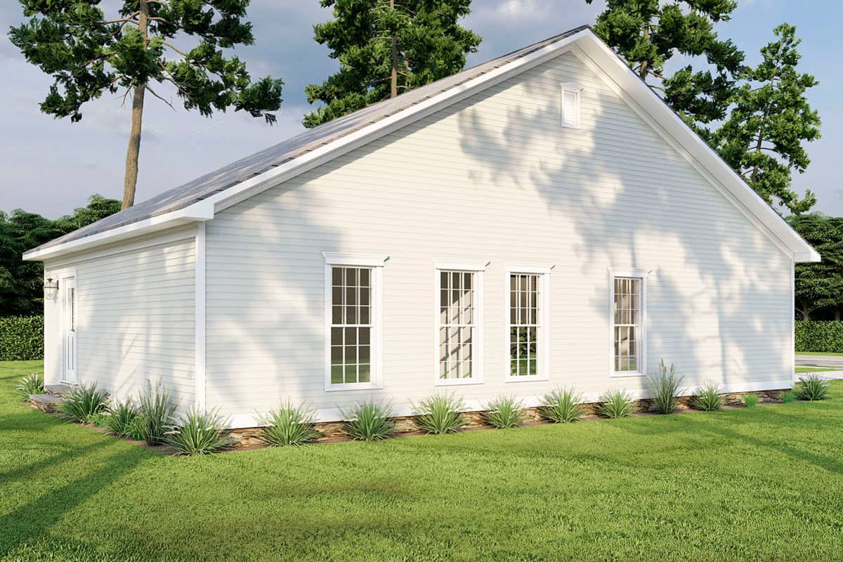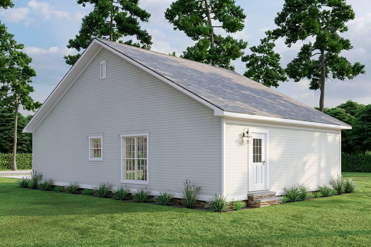 Because the footprint is compact, the home can fit on narrower lots or rural acreage without dominating the landscape. Covered porches or overhangs may be included to add depth and invite outdoor siting.