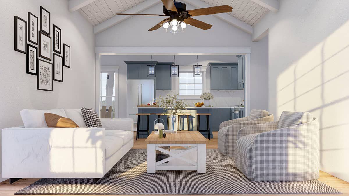 This cozy country cottage provides a comfortable, efficient living space. With approximately **1,284 sq. ft.** of heated area, the design presents **3 bedrooms**, **2 full bathrooms**, and a vaulted central living space that elevates the ambiance without overextending the footprint.