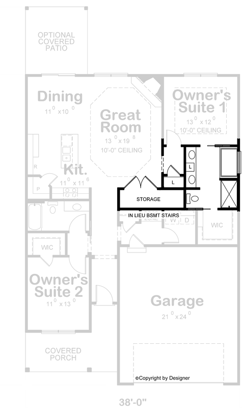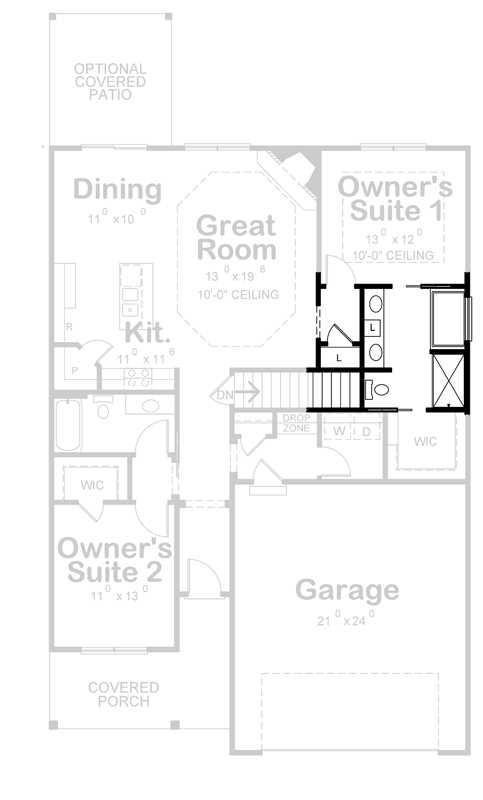 Floor Plan Features: The layout is built around an open living core where the great room and kitchen flow seamlessly. A corner fireplace anchors that space. Sliding glass doors grant access to an optional covered patio. The two owner’s suites are split for privacy, each with walk-in closets; the rear master offers alternate bathroom layouts. 1