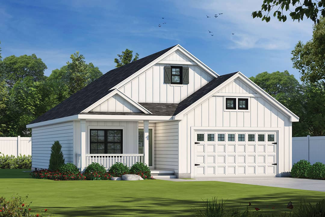 This elegant single-story home balances form, comfort, and flexibility. The design includes **1,387 sq. ft.** of heated living space, **2 master suites**, **2½ bathrooms**, and an attached **2-car garage**. The exterior presents a New American aesthetic with a clean yet welcoming façade and thoughtful roof and porch detailing. 0