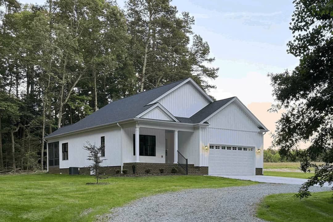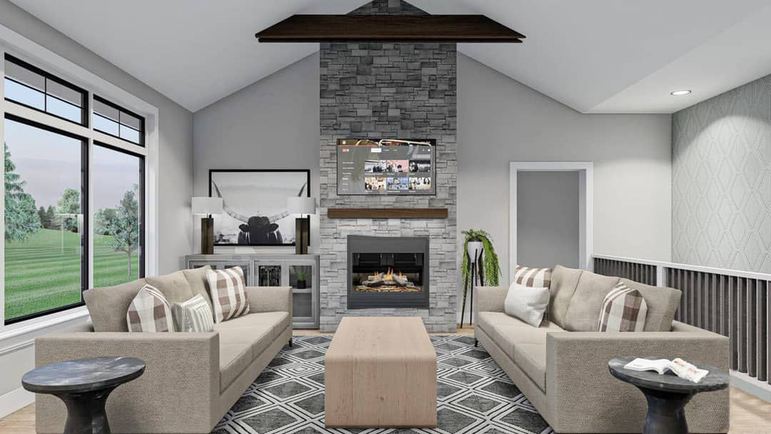 The façade blends traditional and modern touches. Roof pitches, siding choices, and a balanced porch align to give depth and approachability. The garage is integrated front-entry style, making it functional while maintaining visual balance. 2